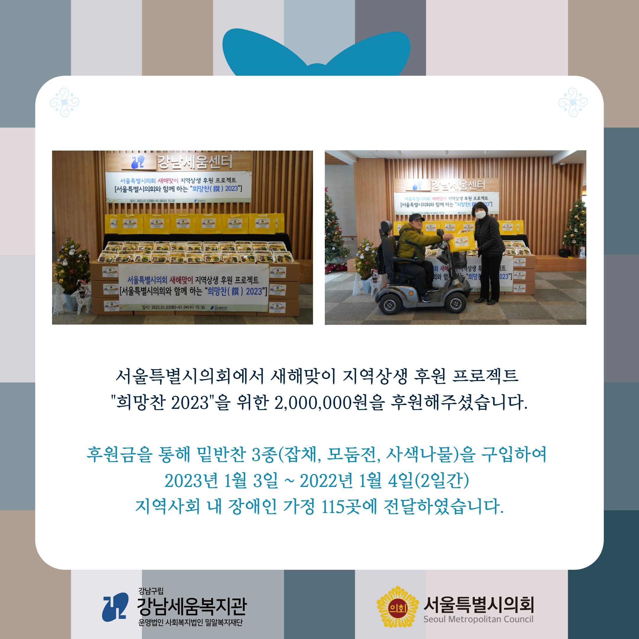서울특별시의회에서 새해맞이 지역상생 후원 프로젝트 “희망찬(饌) 2023”을 위한 2,000,000원을 후원해주셨습니다. 후원금을 통해 밑반찬 3종(잡채, 모둠전, 사색나물)을 구입하여 2023년 1월 3일, 4일(2일간) 지역사회 내 장애인 가정 115곳에 전달하였습니다.