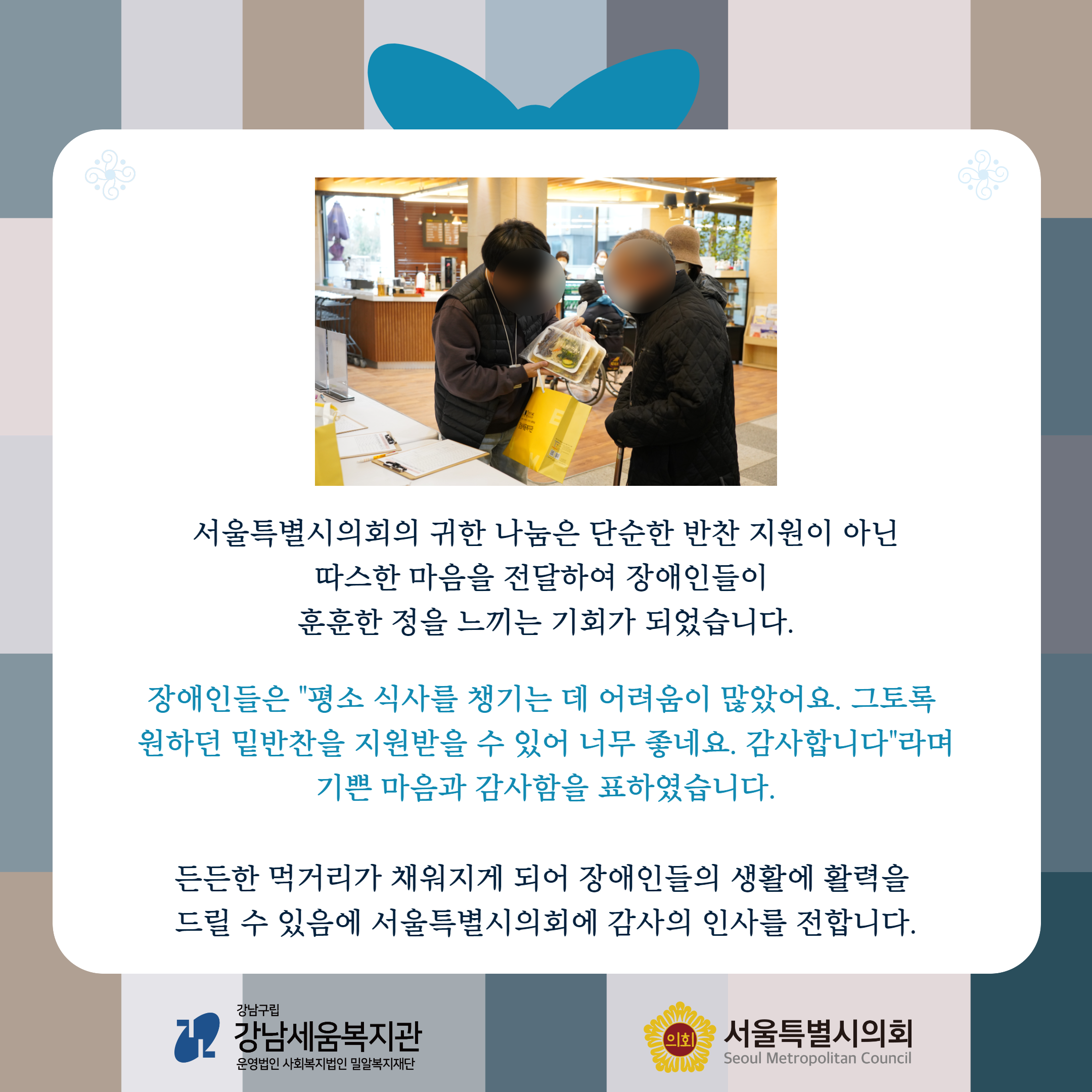 서울특별시의회의 귀한 나눔은 단순한 반찬 지원이 아닌 따스한 마음을 전달하여 장애인들이 훈훈한 정을 느끼는 기회가 되었습니다. 장애인들은 “평소 식사를 챙기는 데 어려움이 많았어요. 그토록 원하던 밑반찬을 지원받을 수 있어 너무 좋네요. 감사합니다.”라며 기쁜 마음과 감사함을 표하였습니다.