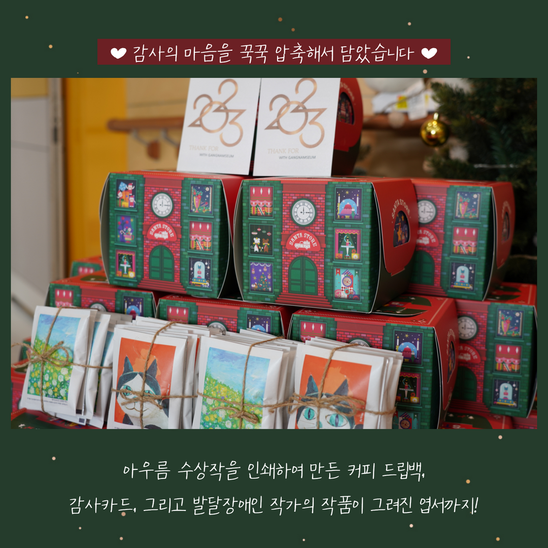 감사키트는 아우름 수상작을 인쇄한 커피 드립백과 엽서, 감사카드로 구성되었고, 총 100개의 감사키트가 자원봉사자, 후원자님들에게 무사히 전달되었습니다. 멋진 그림만큼이나 맛도 좋은 드립백 커피의 좋은 향과 맛이 자원봉사자, 후원자님들의 일상에 소소한 행복을 가져다주길 바라겠습니다.