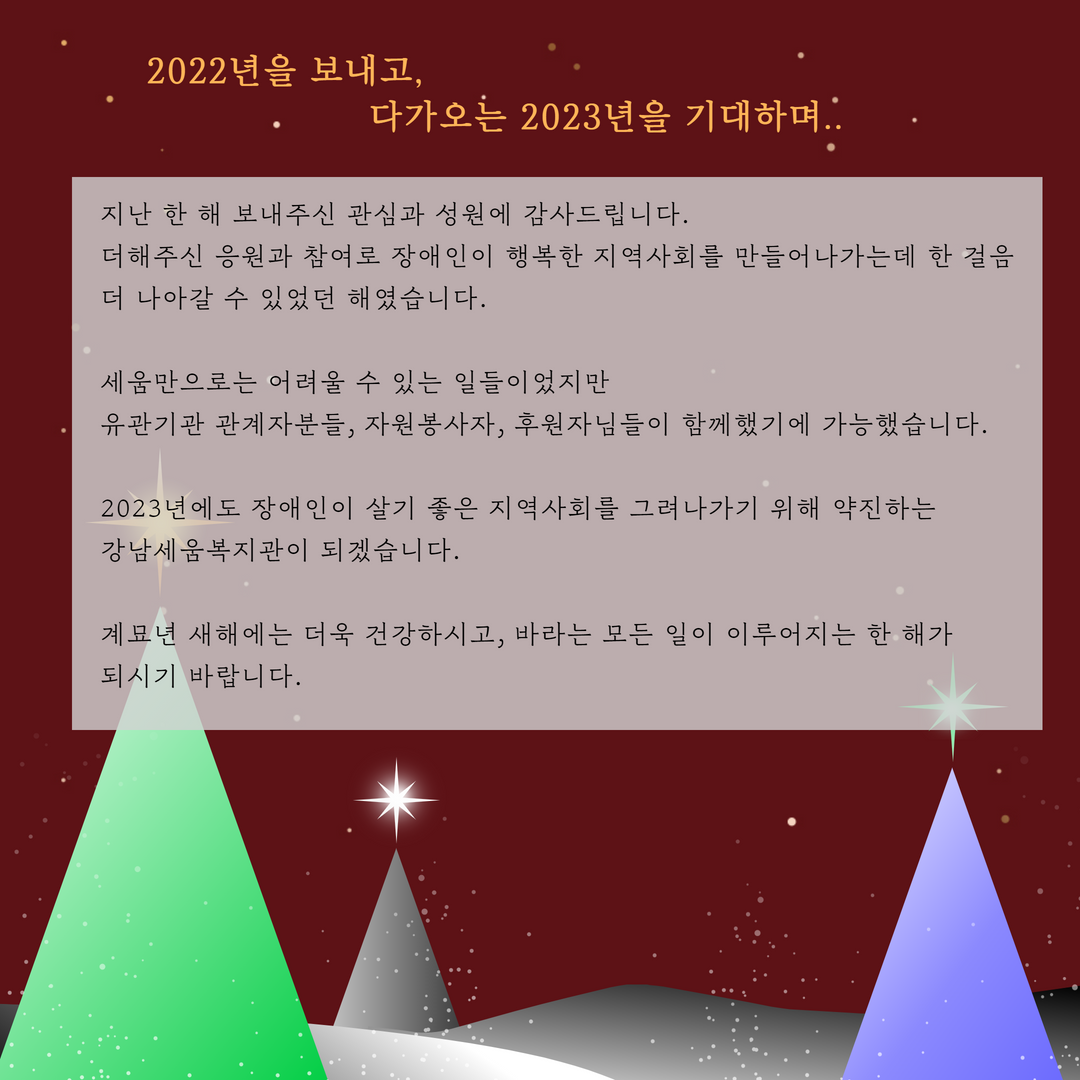 2022년에 강남세움복지관과 함께해주셔서 감사하며, 앞으로도 지역사회 장애인들의 행복한 일상을 만들어 나가는데도 함께 할 수 있기를 기대하겠습니다. 감사합니다.