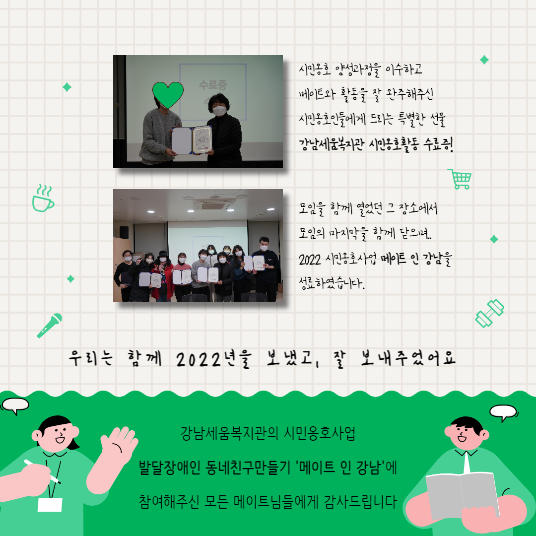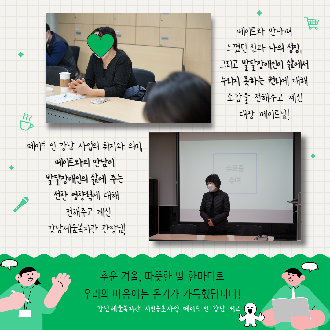 지난 6개월 동안의 활동을 공유하고, 활동에 참여한 소감에 대해 나누었습니다. 2년 연속으로 사업에 참여해주신 시민옹호인은 메이트와 만나며 느꼈던 점과 나의 성장, 그리고 발달장애인이 삶에서 누리지 못하는 권리에 대한 소감을 전하여 모두의 마음에 뜨거운 울림을 주었습니다. 강남세움복지관 김귀자 관장은 메이트 인 강남 사업의 취지와 의미, 메이트와의 만남이 발달장애인의 삶에 주는 선한 영향력에 대해 이야기하며 시민옹호인들을 격려하여 주셨습니다. 추운 겨울, 따뜻한 말 한마디로 참여한 모두의 마음에는 온기가 가득했습니다. 시민옹호 양성과정을 이수하고, 메이트와 활동을 잘 완주해주신 시민옹호인들에게는 ‘강남세움복지관 시민옹호 활동 수료증’이 수여되었습니다.