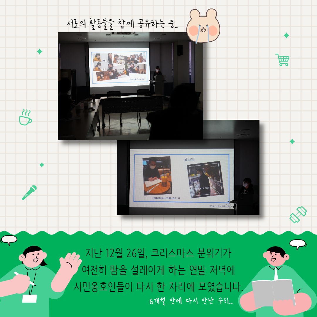 모임을 함께 열었던 그 장소에서 모임의 마지막을 함께 닫으며 2022년 시민옹호사업 메이트 인 강남이 마무리되었습니다. 그동안 본 사업에 보내주신 관심과 참여에 감사드립니다.