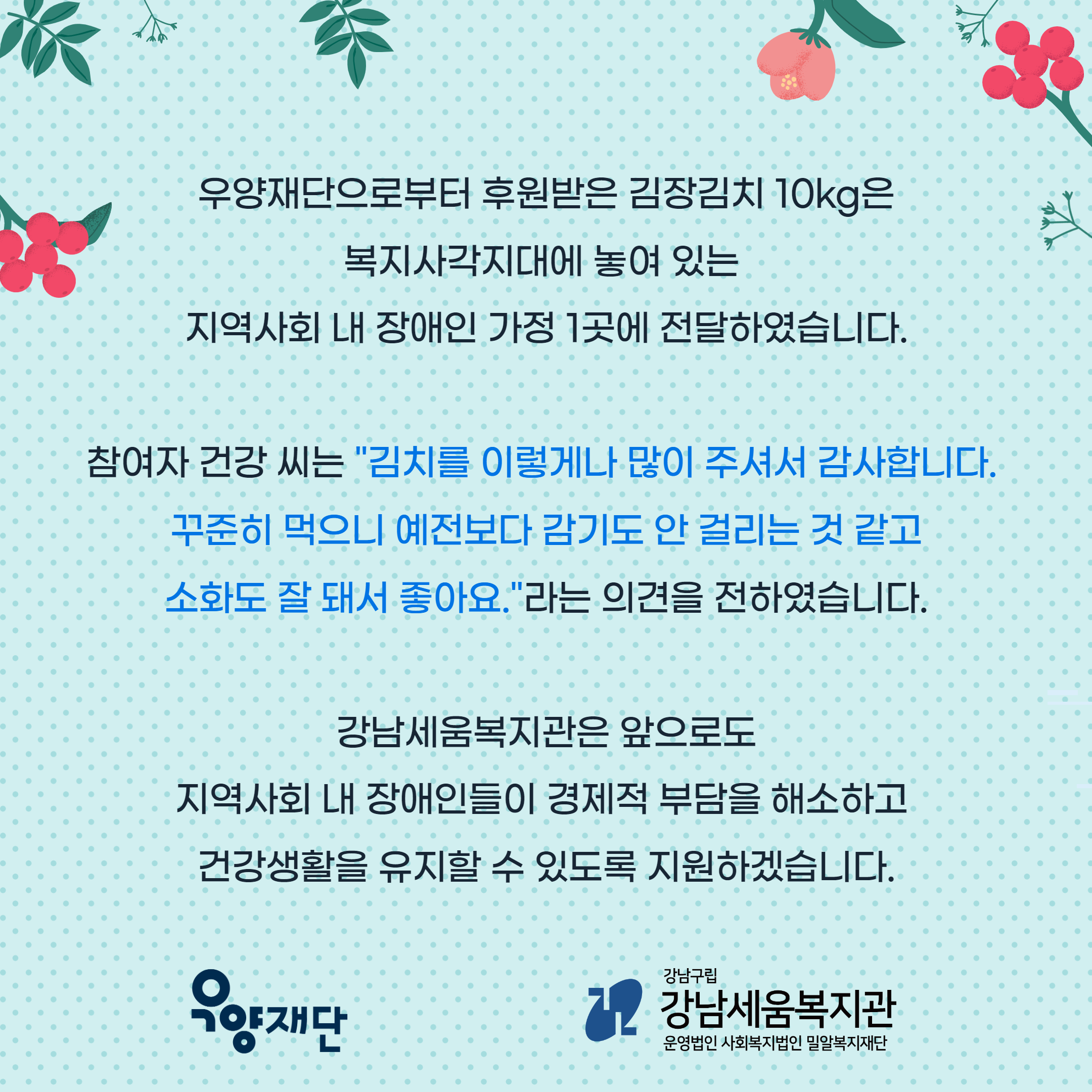 우양재단으로부터 후원받은 김장김치 10kg은 복지 사각지대에 놓여 있는 지역사회 내 장애인가정 1곳에 전달하였습니다.