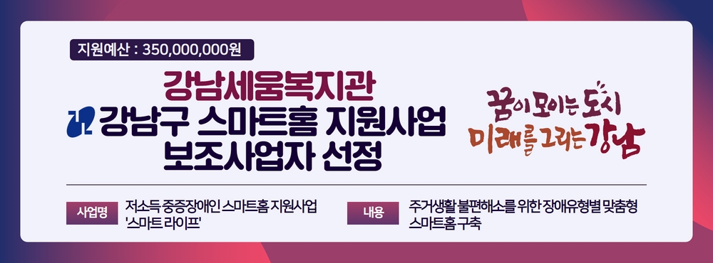 강남세움복지관은 강남구청에서 주관하는 2023년 강남구 중증장애인 스마트홈 지원사업 보조사업자에 선정되었습니다.