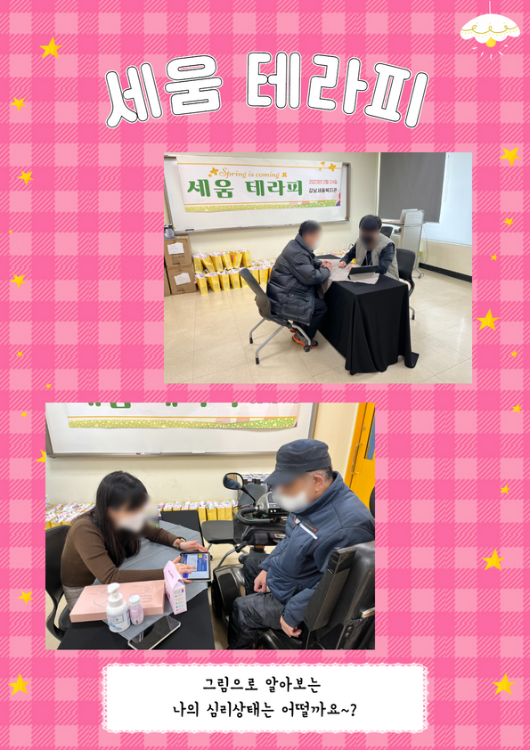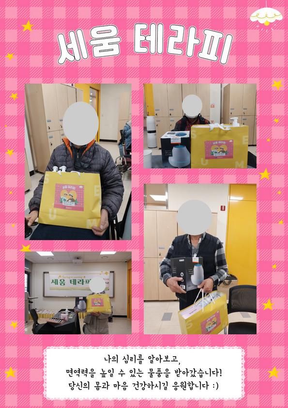 - 맞춤형서비스팀에서는 사례관리 및 재가 서비스 참여자 100명을 대상으로 심리검사를 진행하고, 환절기 대비 면역력 강화를 위한 물품을 지원하였습니다. 세움 가족 여러분들도 모두 건강하시길 바랍니다!