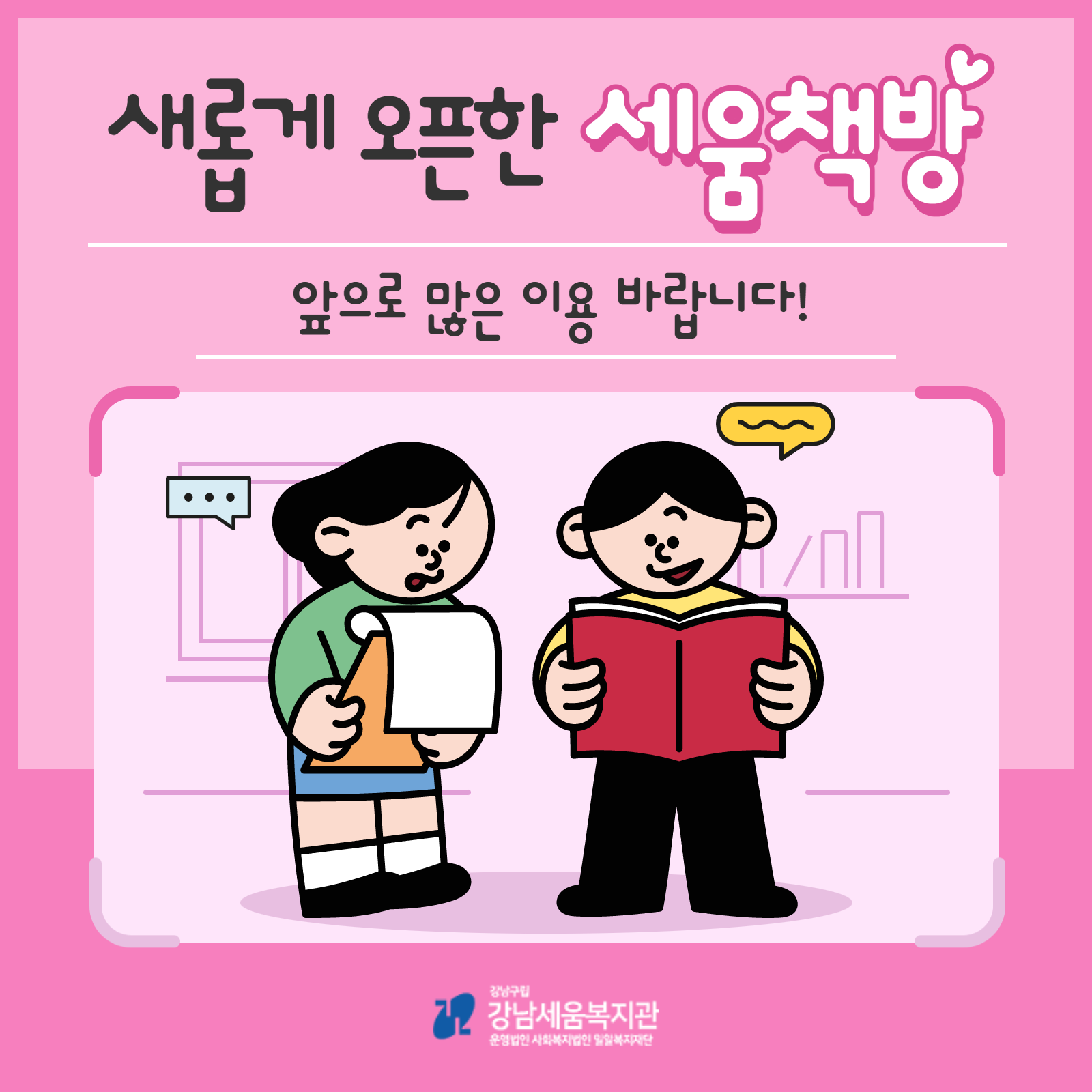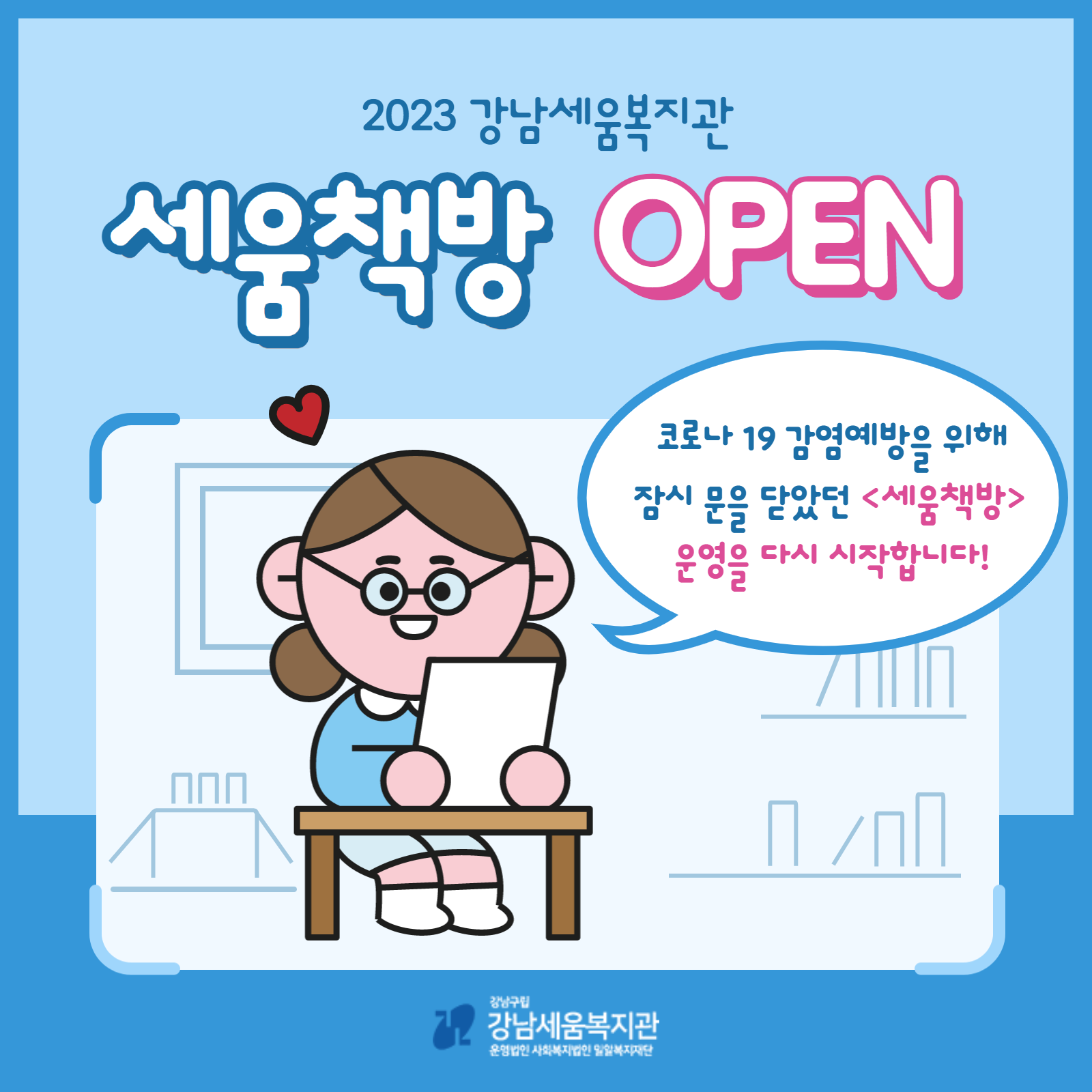 코로나 19 감염예방을 위해 잠시 문을 닫았던 작은도서관 ‘세움책방’이 개방되었습니다. 강남세움복지관 6층에 위치한 세움책방은 복지관을 이용하는 이용자, 주민, 보호자 등 모든 고객이 이용하실 수 있습니다.