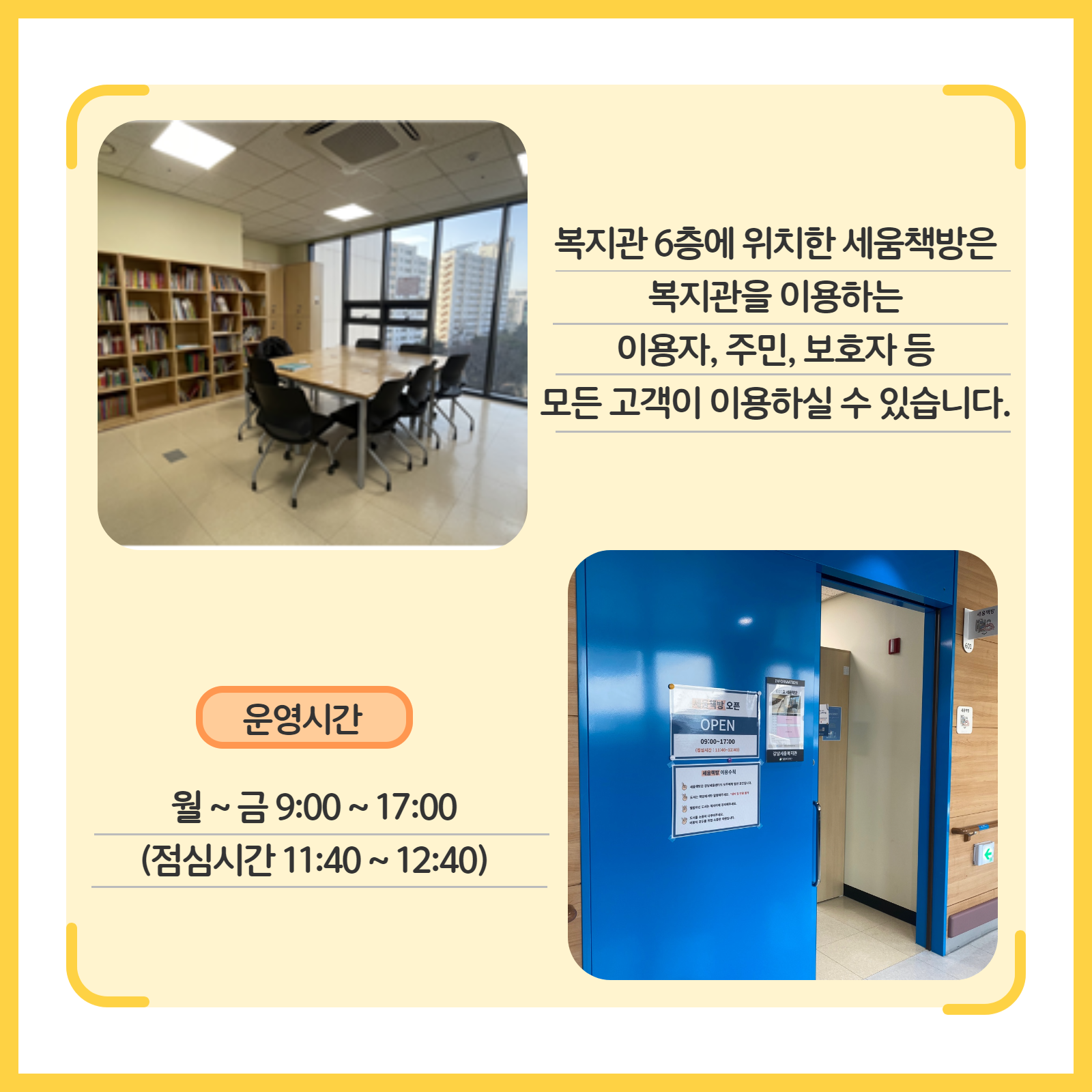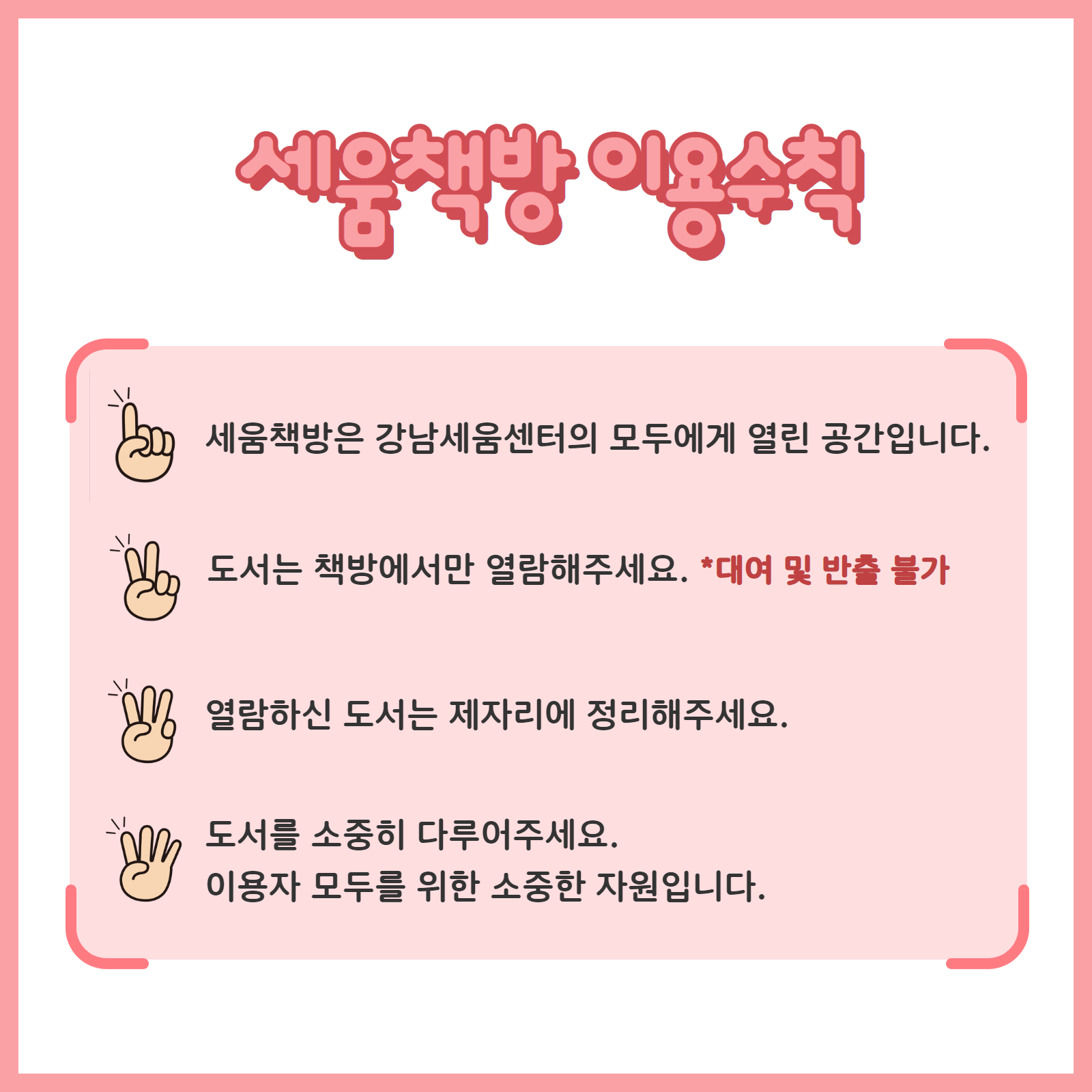 운영시간은 평일 9:00~17:00(점심시간 11:40~12:40)이며, 세움책방 이용수칙을 준수하여 이용을 부탁드립니다.