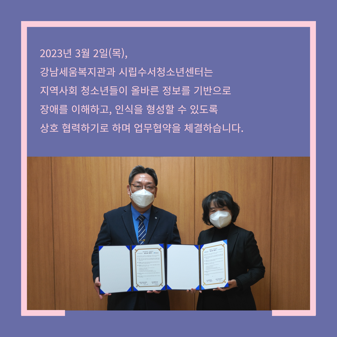 지난 3월 2일(목), 강남세움복지관은 시립수서청소년센터와 청소년의 장애인식개선을 위한 업무협약을 체결하였습니다. 협약에 앞서 2월 한 차례 실무자 사업 회의를 진행하며 당사자 참여형 인식개선 컨텐츠에 대해 논의하며 협력지점을 찾아보았습니다. 강남세움복지관(관장 김귀자)과 시립수서청소년센터(관장 정영화)는 지역사회 청소년들이 인권중심 사고에 기반하여 장애를 이해하고, 인식을 개선해 나갈 수 있도록 상호 협력할 것을 다짐하였습니다.