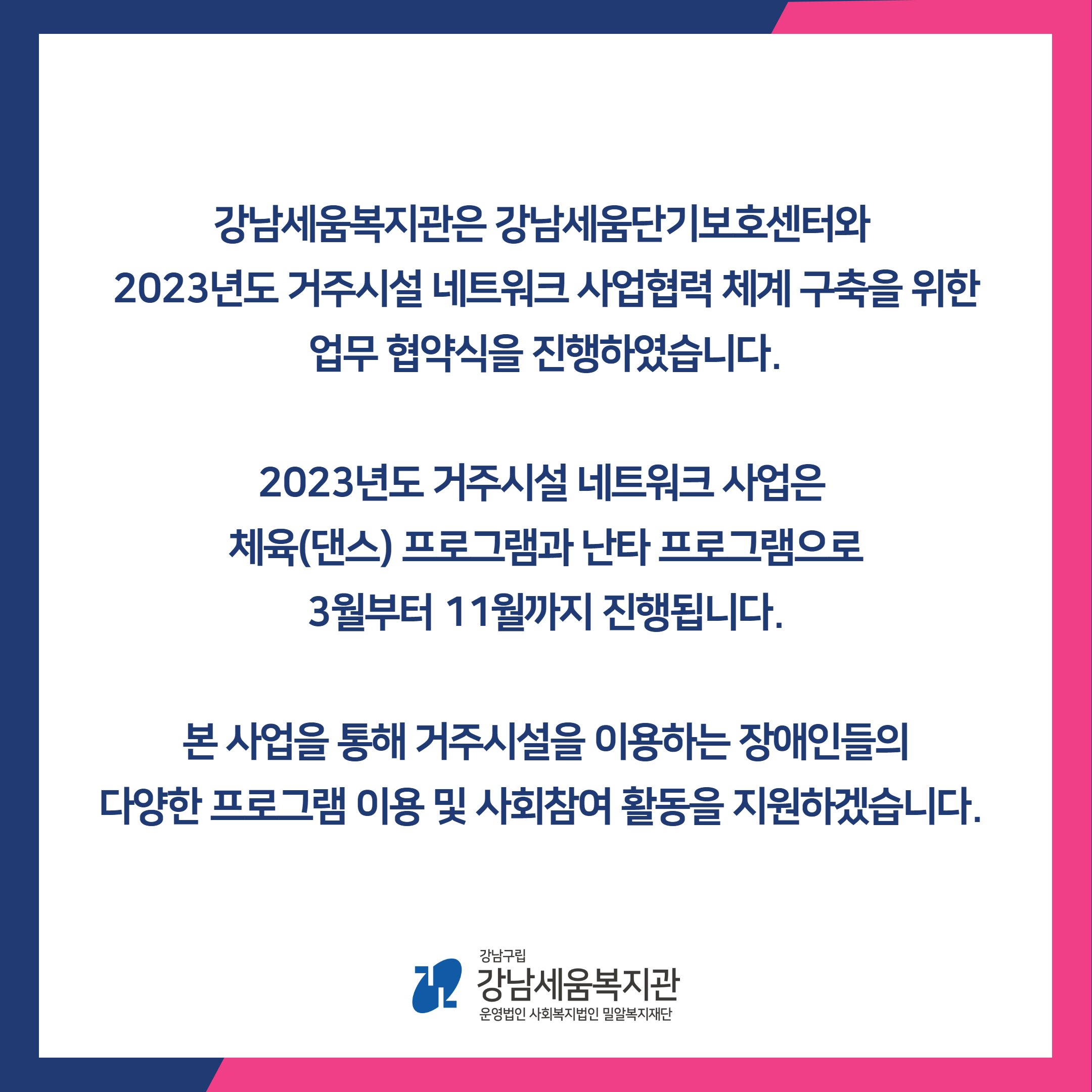 강남세움복지관은 강남세움단기보호센터와 2023년도 거주시설 네트워크 사업협력 체계 구축을 위한 업무협약식을 진행하였습니다. 2023년도 거주시설 네트워크 사업은 체육(댄스) 프로그램과 난타 프로그램으로 3월부터 11월까지 진행됩니다. 본 사업을 통해 거주시설을 이용하는 장애인들의 다양한 프로그램 이용 및 사회참여 활동을 지원하겠습니다.