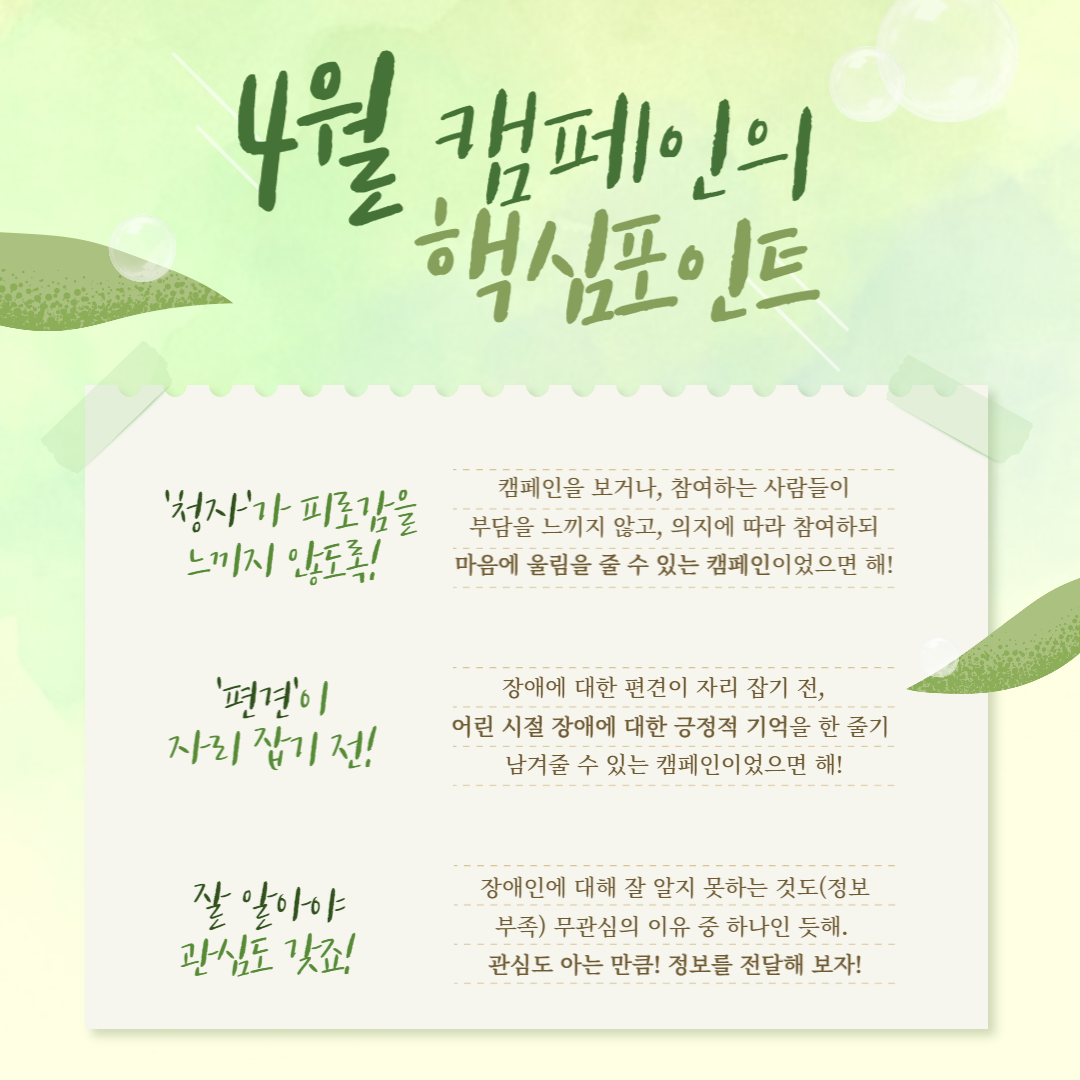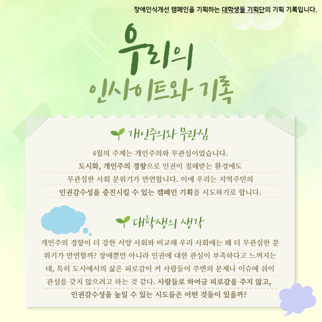 지역사회에서 장애인식개선 캠페인을 기획하는 대학생 기획단의 기획이야기를 소개합니다. 지난 3월부터 대학생만의 인사이트와 아이디어를 나누며 기획을 시작했습니다. 4월의 인사이트는 ‘개인주의와 무관심’입니다. 장애라는 이슈를 접하는 대중들의 무관심에 메시지를 던지기 위해 대학생기획단은 두 가지 캠페인을 기획했습니다.