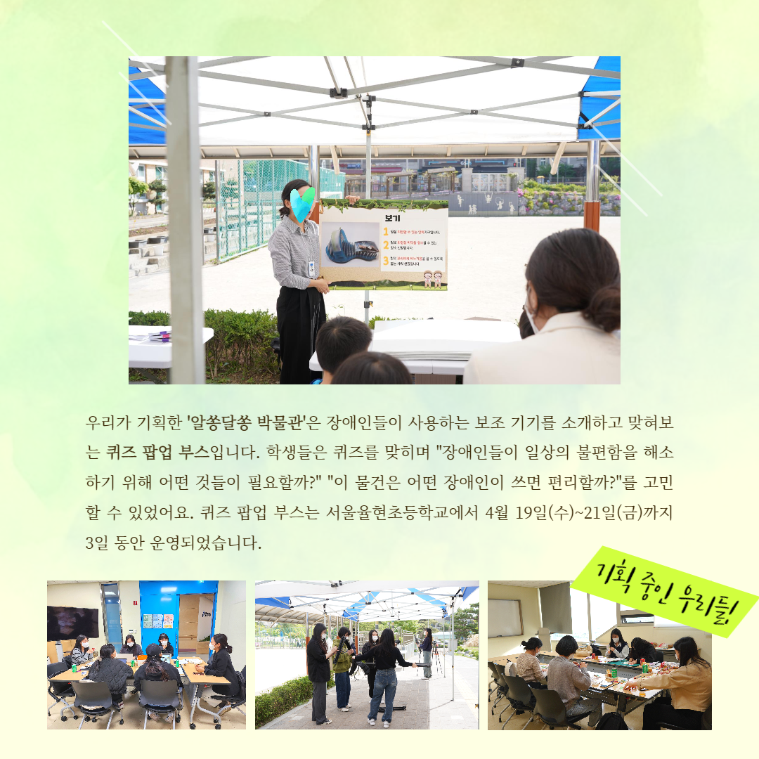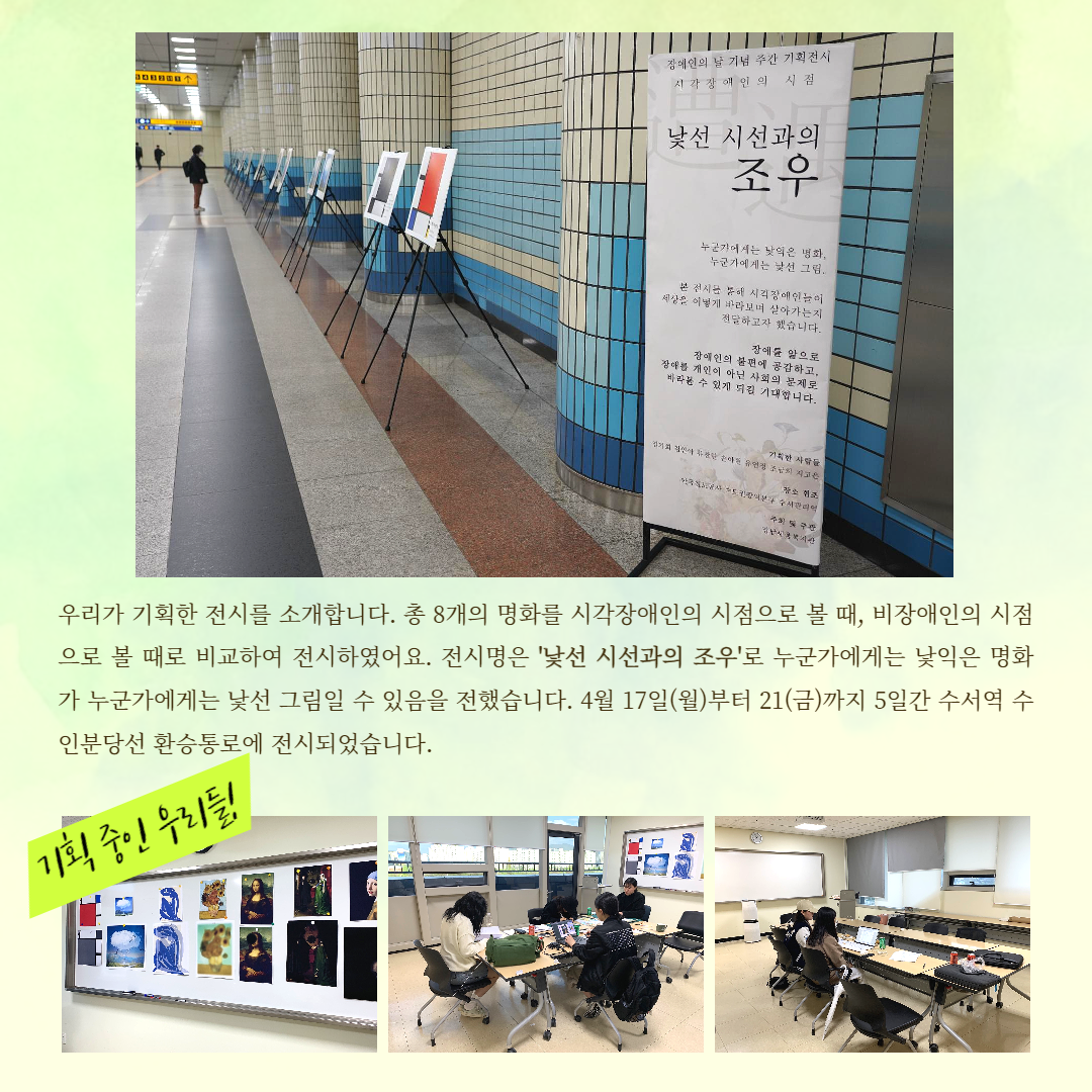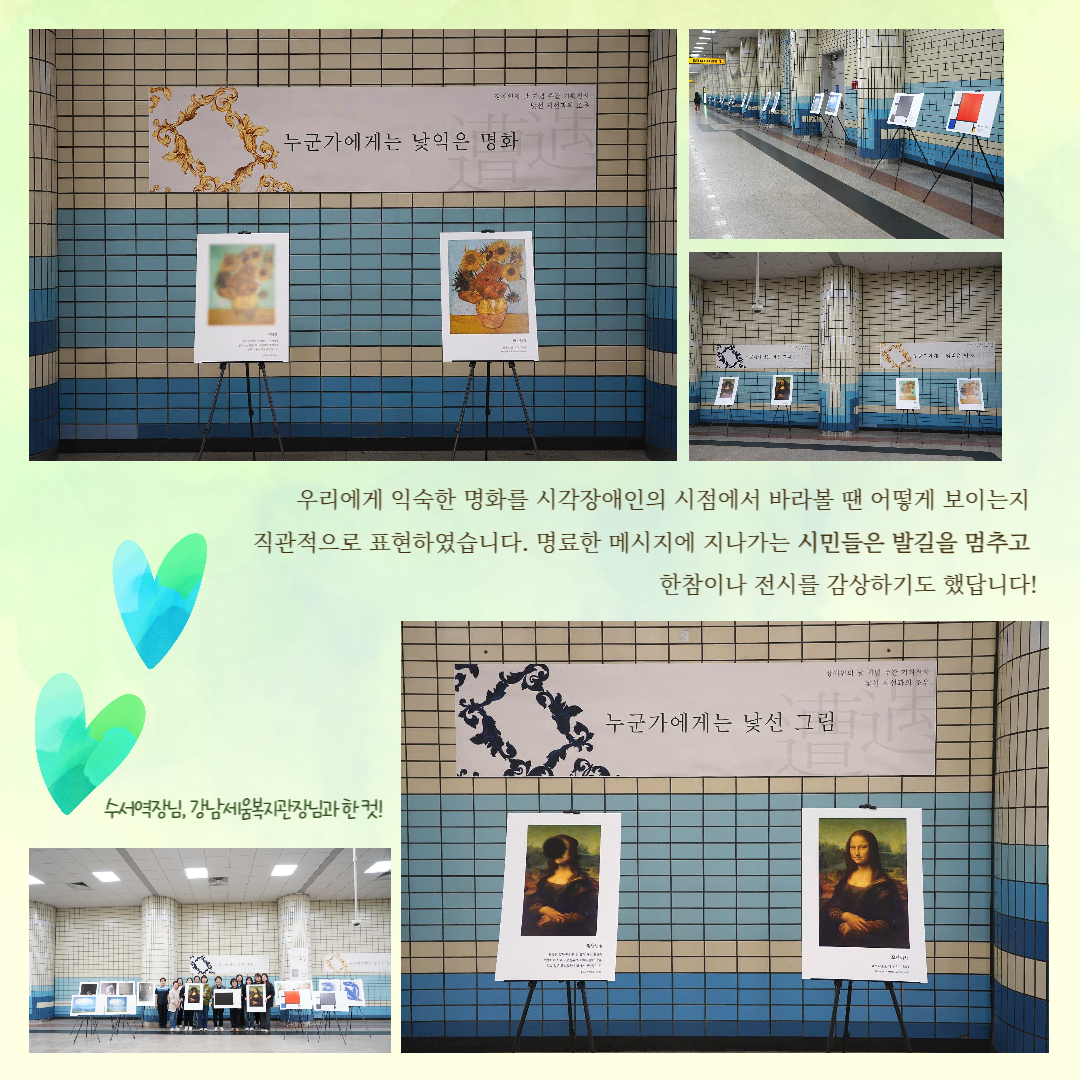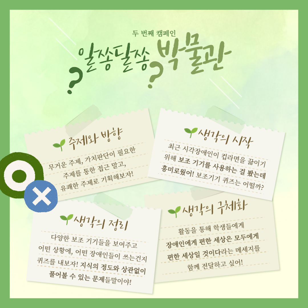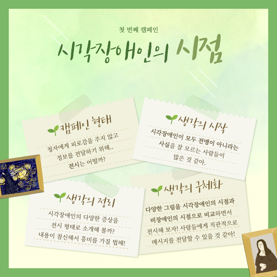 첫 번째 캠페인은 기획 전시로 전시 명은 ‘시각장애인의 시점’입니다. 시각장애인의 8가지 증상을 명화를 활용하여 대중들에게 소개하였습니다. 두 번째 캠페인은 장애와 관련된 퀴즈 팝업 부스 ‘알쏭달쏭 박물관’입니다. 장애인이 사용하는 열 가지 보조 기기를 맞히는 퀴즈 팝업 부스를 운영했습니다.