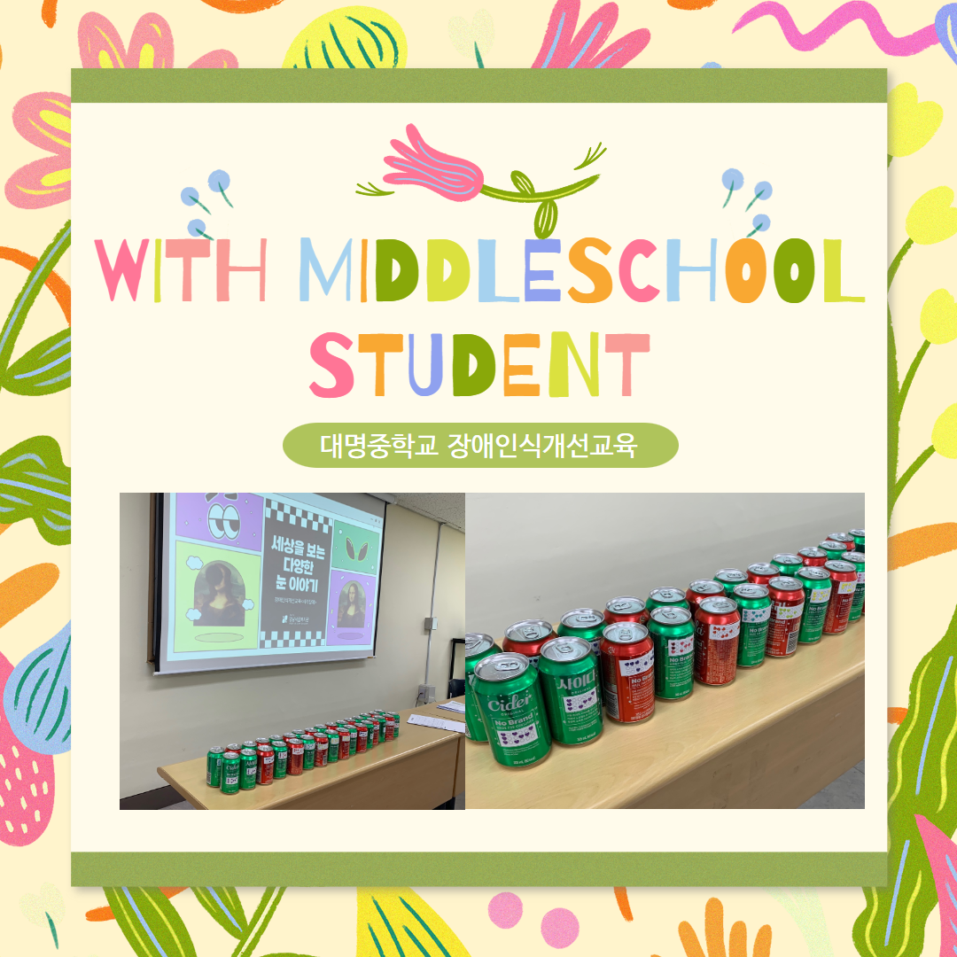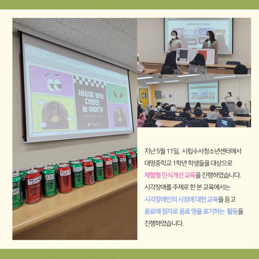 지난 5월 11일 목요일, 시립수서청소년센터에서 대명중학교 1학년 학생들과 장애인식개선교육을 위해 만났습니다. 시각장애를 주제로 한 본 교육에서는 시각장애의 정의와 보조기기를 소개하고, 시각장애인들이 8가지 시점을 공유하며 그들이 일상에서 경험하는 불편함에 대해 논의해보는 시간을 가졌습니다. 이후 시각장애인이 사용하는 언어인 점자가 무엇인지 배우고, 본인의 이름을 점자로 써보고, 음료수 이름을 점자로 표기해보는 활동도 함께 진행하였습니다. 활기찬 에너지로 교육에 참여한 학생들은 시각장애인의 다양한 시점에 대해 배우고, 그들의 일상 속 불편함을 고민해볼 수 있어 유익했다는 소감을 전했습니다.