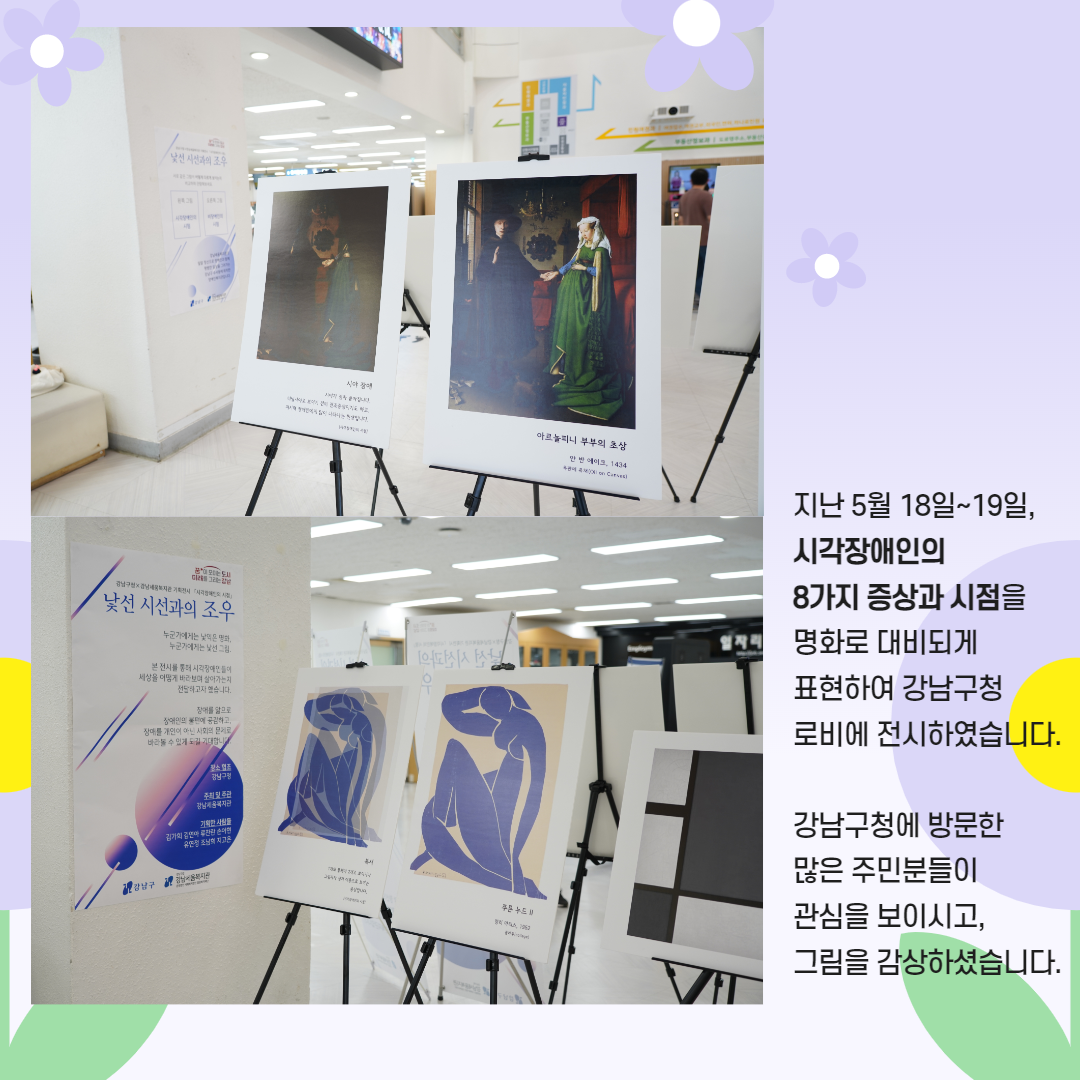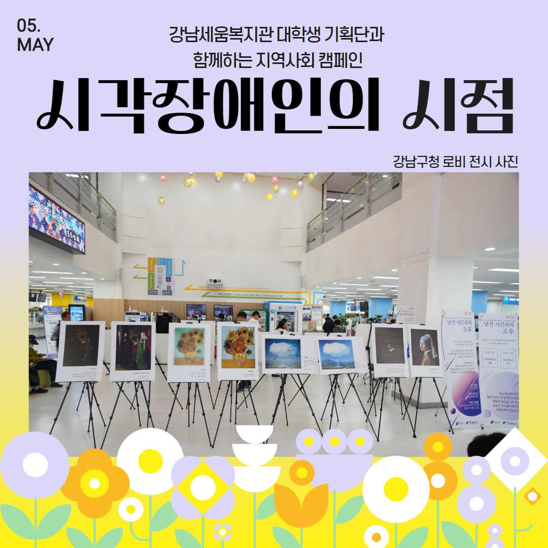 지난 5월 18일(목)~19일(금), 강남구청 장애인복지과의 지원으로 강남구청 로비에 본 기관의 대학생 기획단이 기획한 장애인식개선 전시 ‘시각장애인의 시점:낯선 시선과의 조우’가 전시되었습니다. 시각장애인의 8가지 시점을 표현한 본 전시는 지역주민의 반응과 호응이 높아 다양한 장소에서 전시되었으며, 강남구청 로비에 전시된 이틀간 100여명의 주민들은 대학생 기획단으로부터 직접 전시 설명을 듣고 그림을 감상하였습니다. 대학생 기획단들은 본 컨텐츠가 시민들에게 주는 영향력에 감탄하며, 앞으로도 장애인식개선을 위한 다양한 컨텐츠를 만들기 위해 노력하겠다는 의지를 보였습니다.