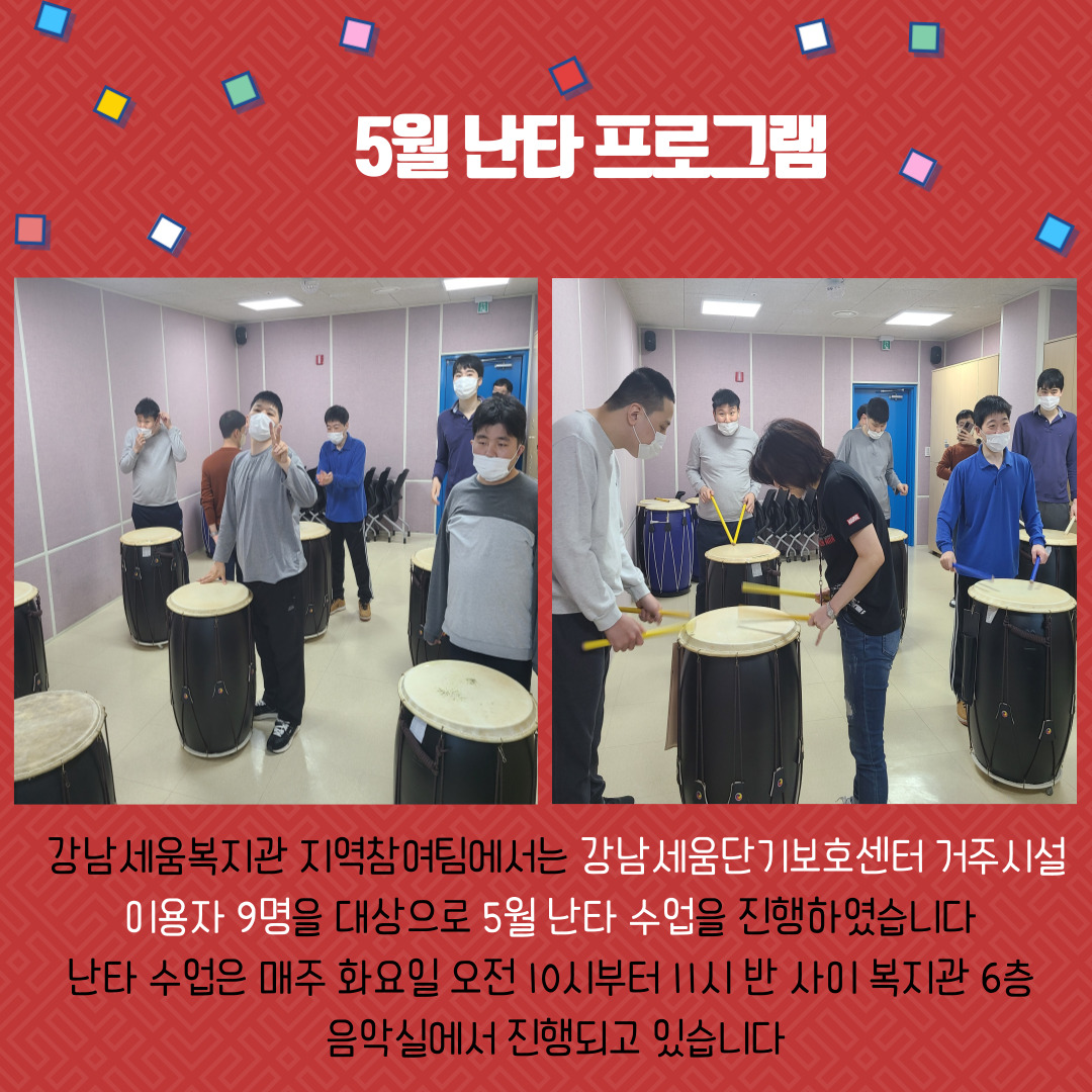강남세움복지관 지역참여팀에서는 강남세움단기보호센터 거주시설 이용자 9명을 대상으로 5월 난타 수업을 진행하였습니다. 난타 수업은 매주 화요일 오전 10시부터 11시 반 사이 복지관 6층 음악실에서 진행되고 있으며, ‘얼굴 찌푸리지 말아요’, ‘네모의 꿈’, ‘네잎클로버’ 세 가지의 음원을 월별로 번갈아 가며 연주하였습니다. 참여자들은 연주 노래를 반복해서 들으며 난타 연주법을 익혀갔습니다. 강사의 시연을 보고 연주 노래를 부르거나 몸을 좌우로 흔들며 신나게 연주하는 참여자도 있었습니다. 난타 수업은 참여자의 문화·여가 지원을 위해 올해 11월까지 매주 화요일마다 진행될 예정입니다. 꾸준히 난타 수업에 참여하며 스트레스를 날리고 일상에 활력을 더하기 바랍니다.