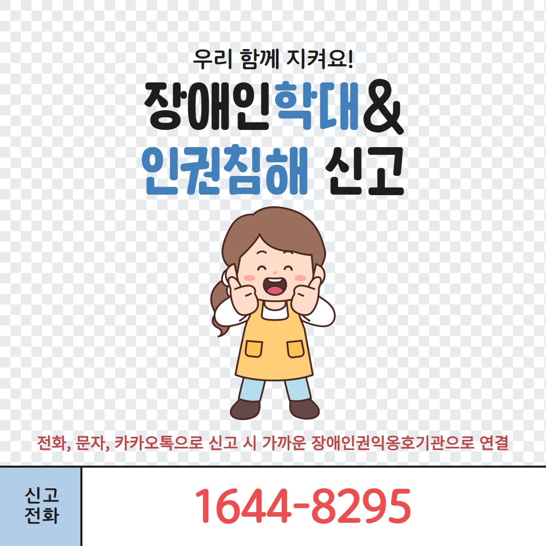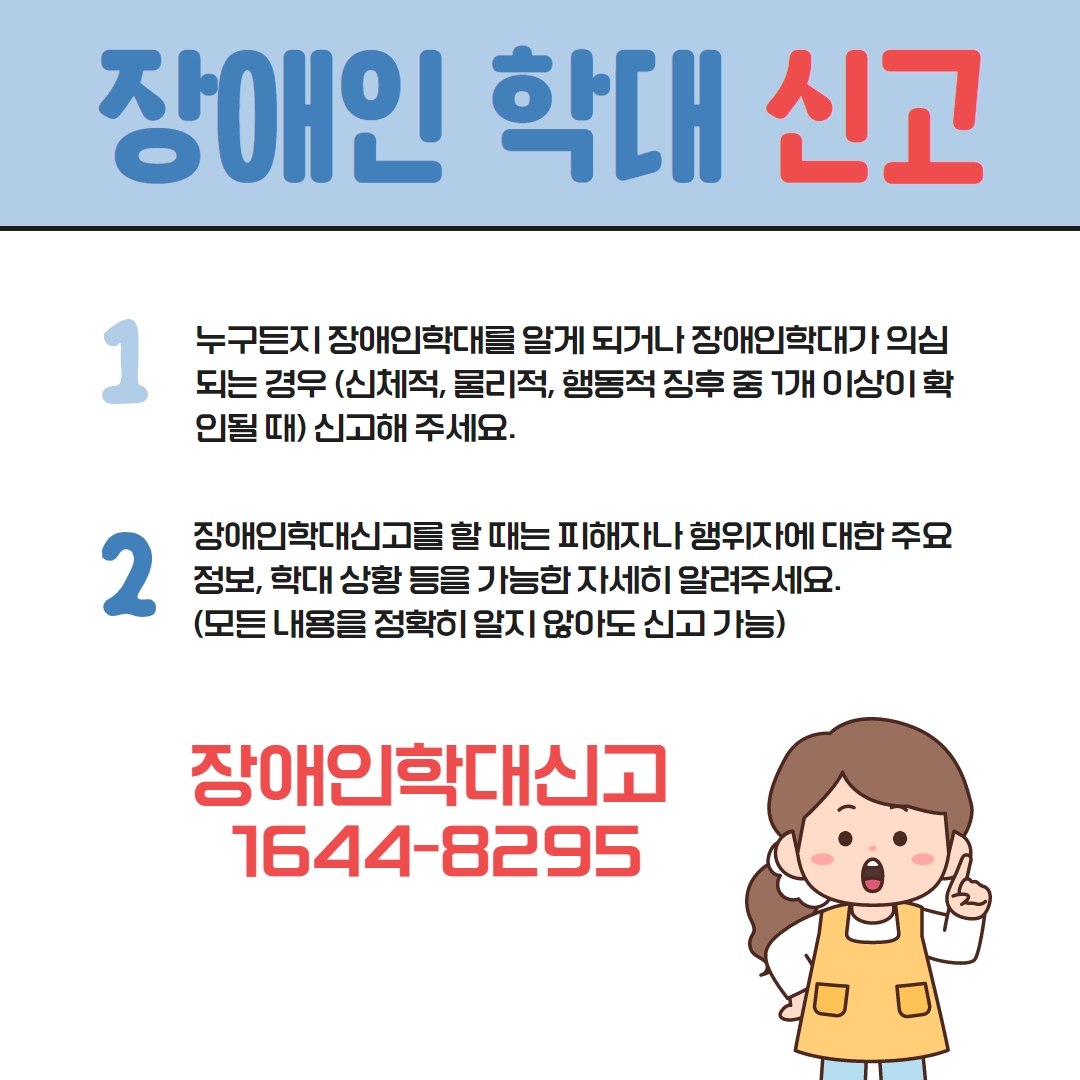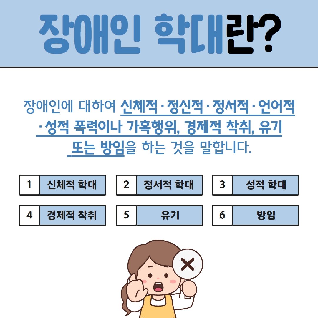장애인에 대하여 신체적, 정신적, 정서적, 언어적, 성적 폭력이나 가혹행위, 경제적 착취, 유기 또는 방임을 하는 것을 말합니다. 누구든지 장애인학대를 알게 되거나 장애인학대가 의심되는 경우(신체적, 물리적, 행동적 징후 중 1개 이상이 확인될 때) 신고해 주세요. 장애인학대신고를 할 때는 피해자나 행위자에 대한 주요 정보, 학대 상황 등을 가능한 자세히 알려주세요.(모든 내용을 정확히 알지 않아도 신고 가능)