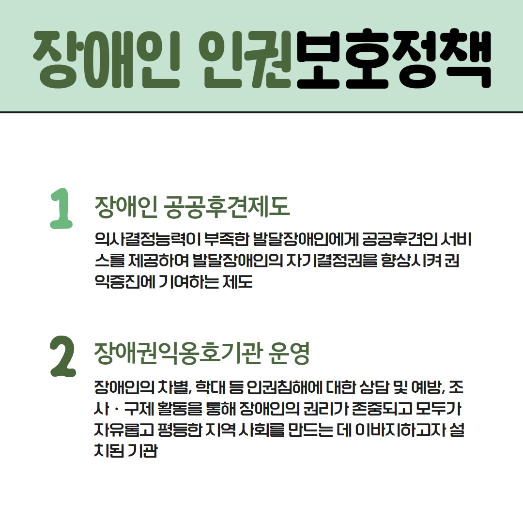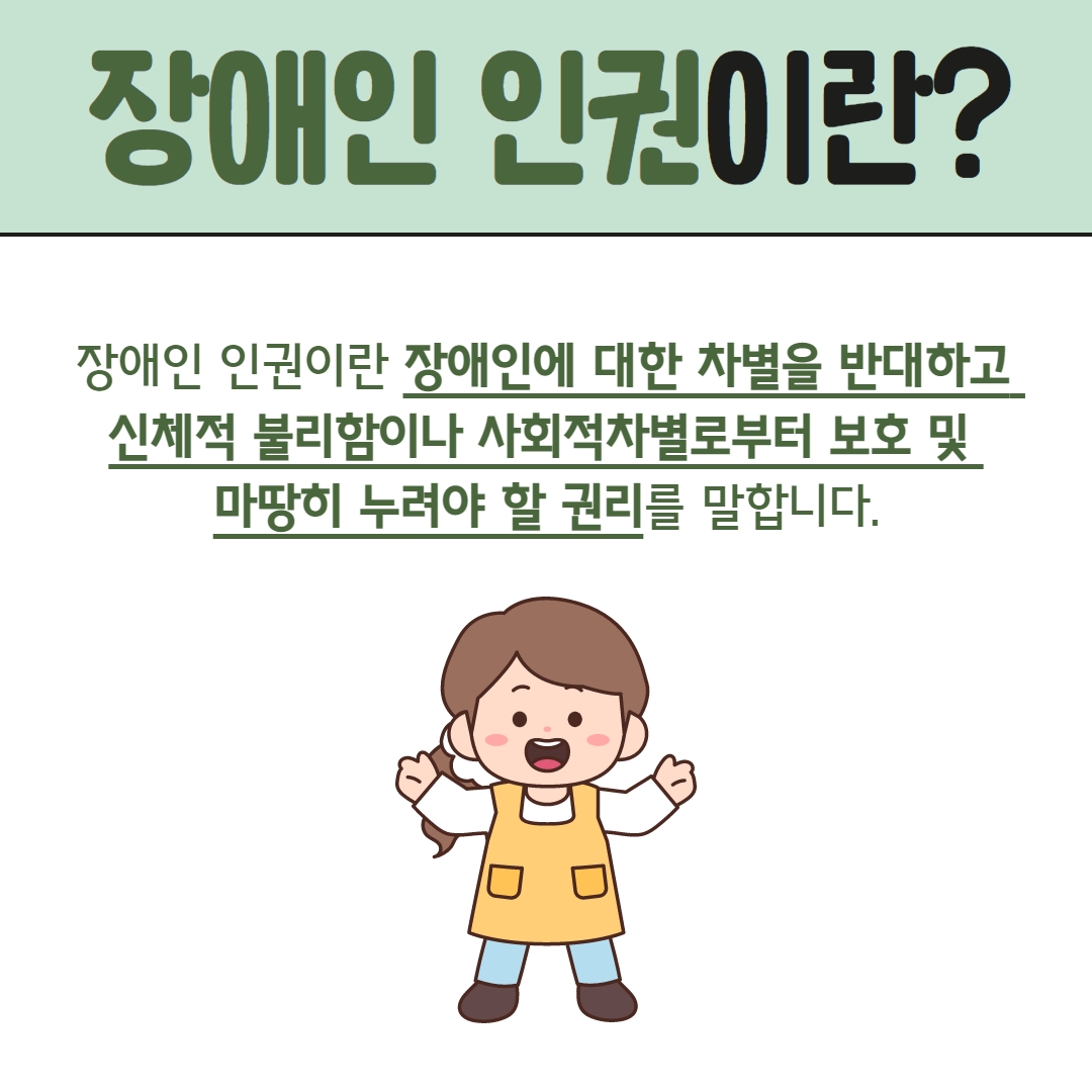 장애인에 대한 차별을 반대하고 신체적 불리함이나 사회적차별로부터 보호 및 마땅히 누려야 할 권리를 말합니다.