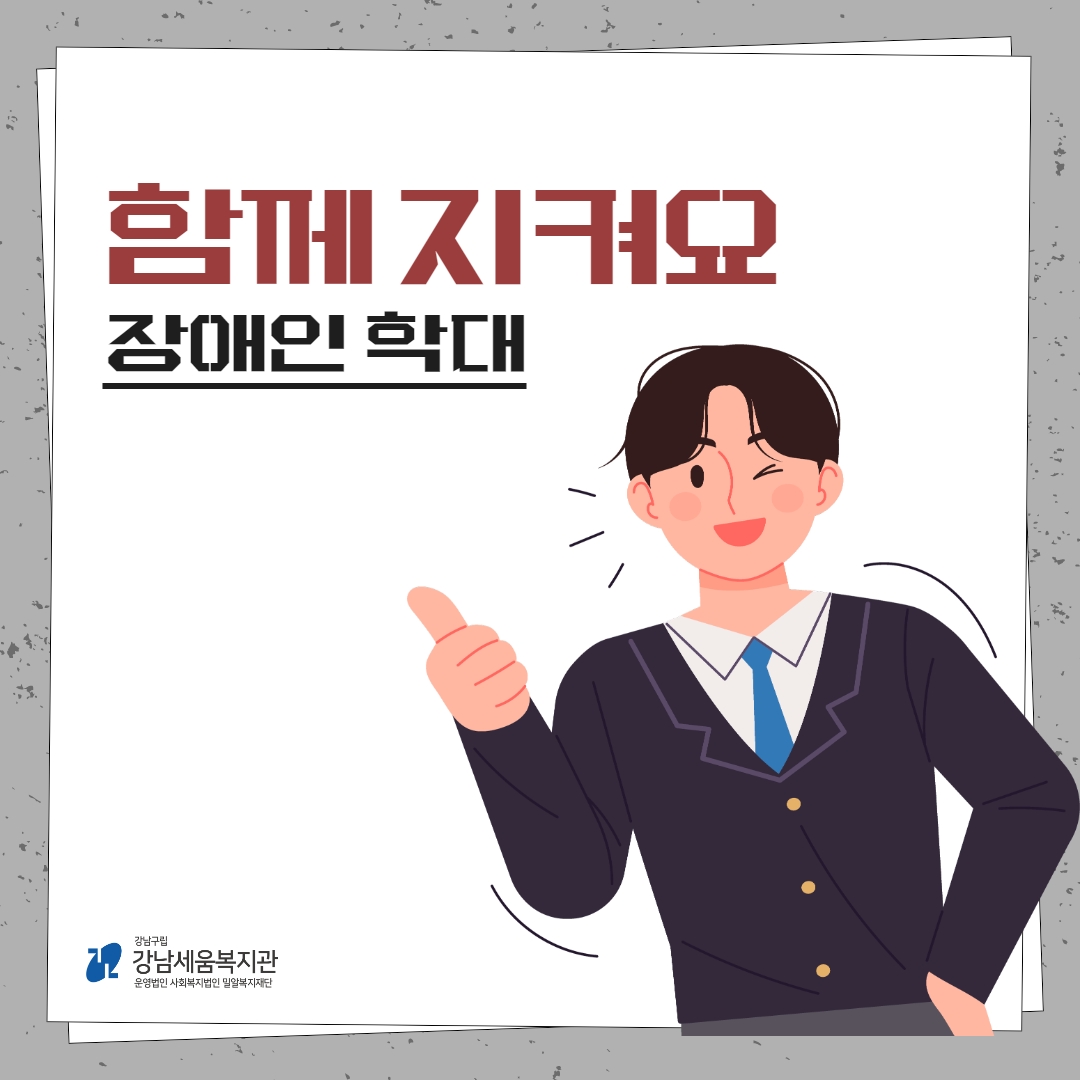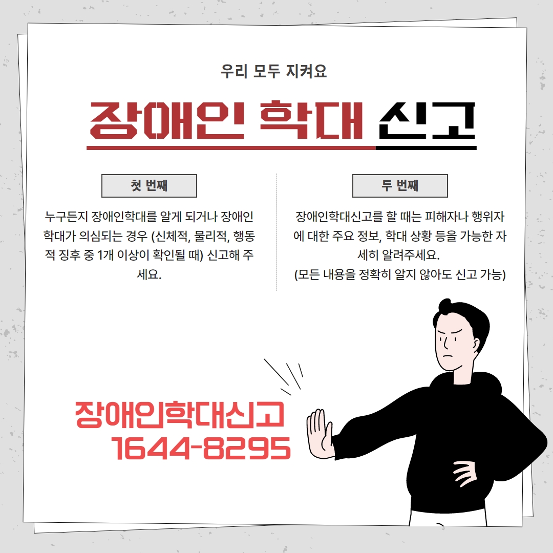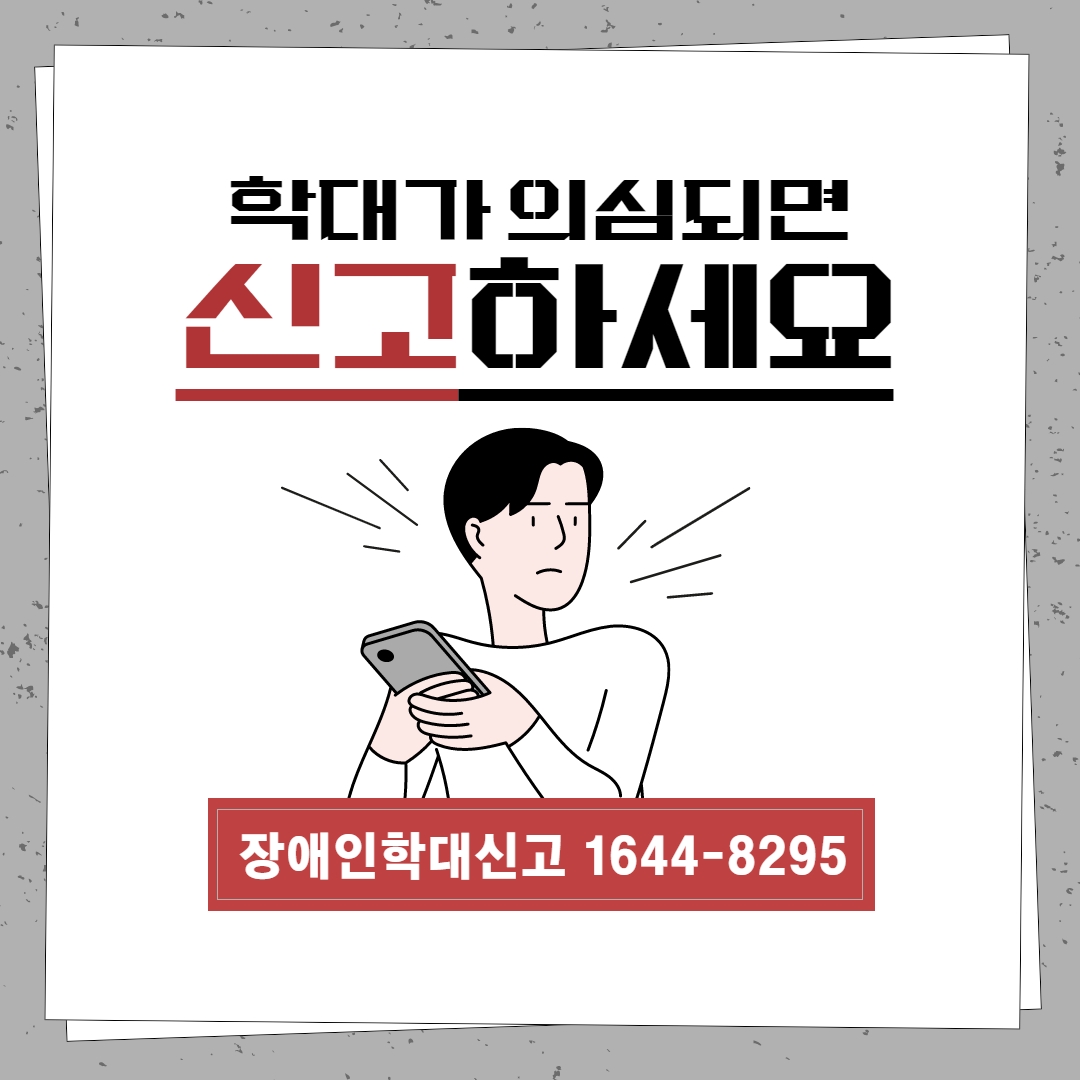 1. 누구든지 장애인학대를 알게 되거나 장애인학대가 의심되는 경우 (신체적, 물리적, 행동적 징후 중 1개 이상이 확인될 때) 신고해주세요.