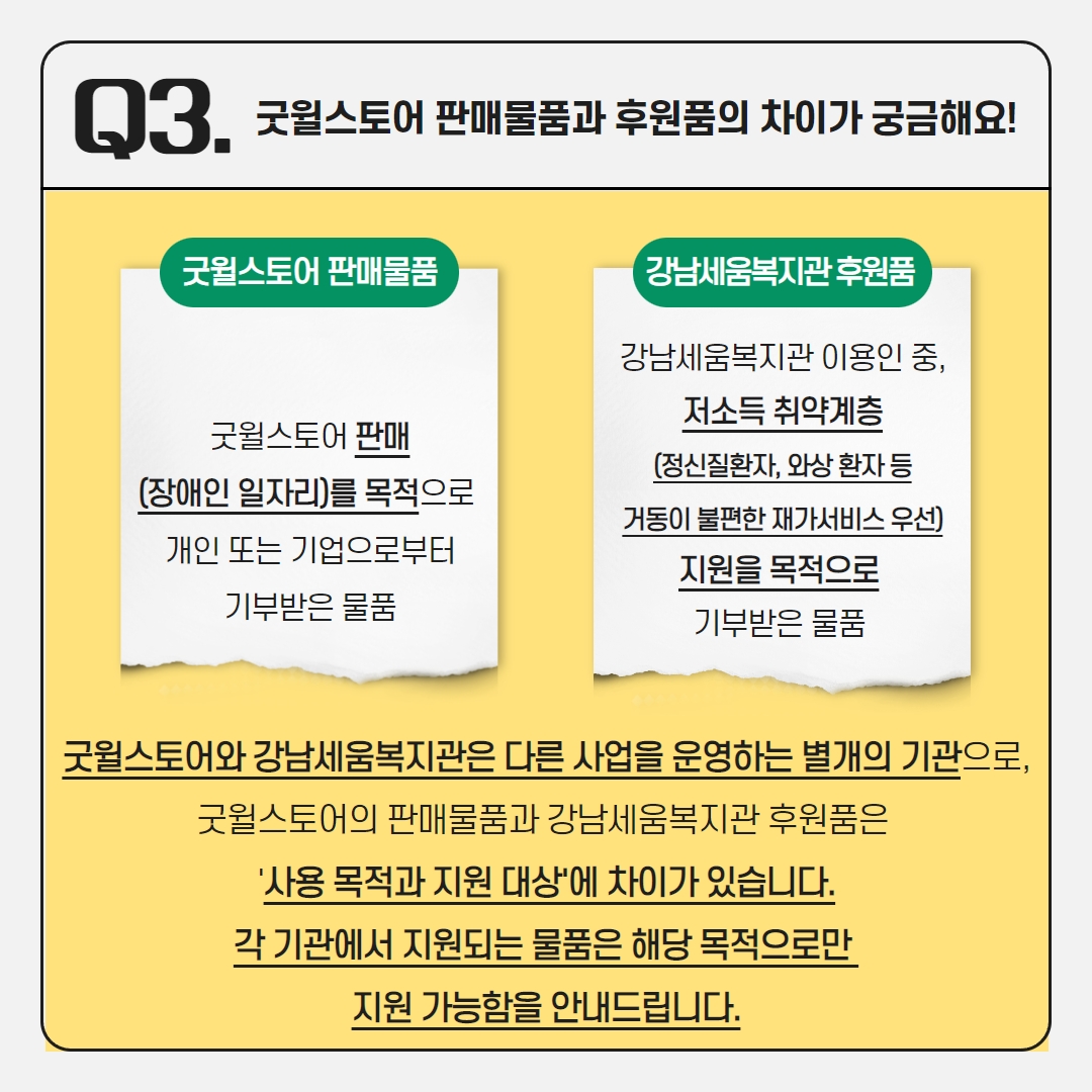 A. 굿윌스토어와 강남세움복지관은 다른 사업을 운영하는 별개의 기관으로, 굿윌스토어의 판매물품과 강남세움복지관 후원품은 '사용 목적과 지원 대상'에 차이가 있습니다.
