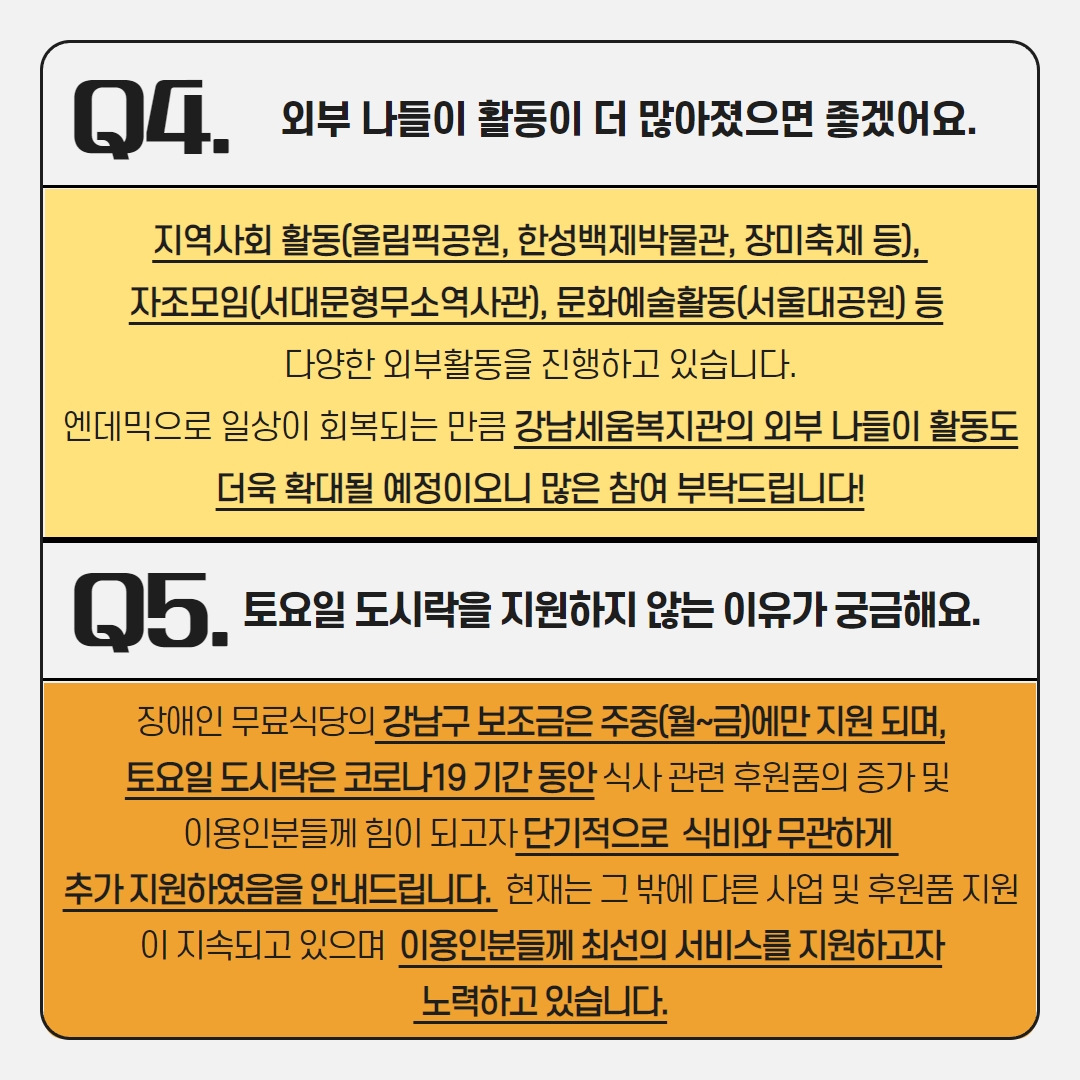A. 장애인 무료식당의 강남구 보조금은 주중(월~금)에만 지원 되며, 토요일 도시락은 코로나19 기간 동안 식사 관련 후원품의 증가 및 이용인분들께 힘이 되고자 단기적으로 식비와 무관하게 추가 지원하였음을 안내드립니다. 현재는 그 밖에 다른 사업 및 후원품 지원이 지속되고 있으며 이용인분들께 최선의 서비스를 지원하고자 노력하고 있습니다.