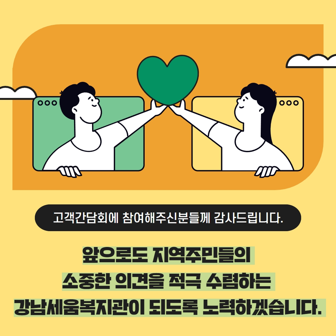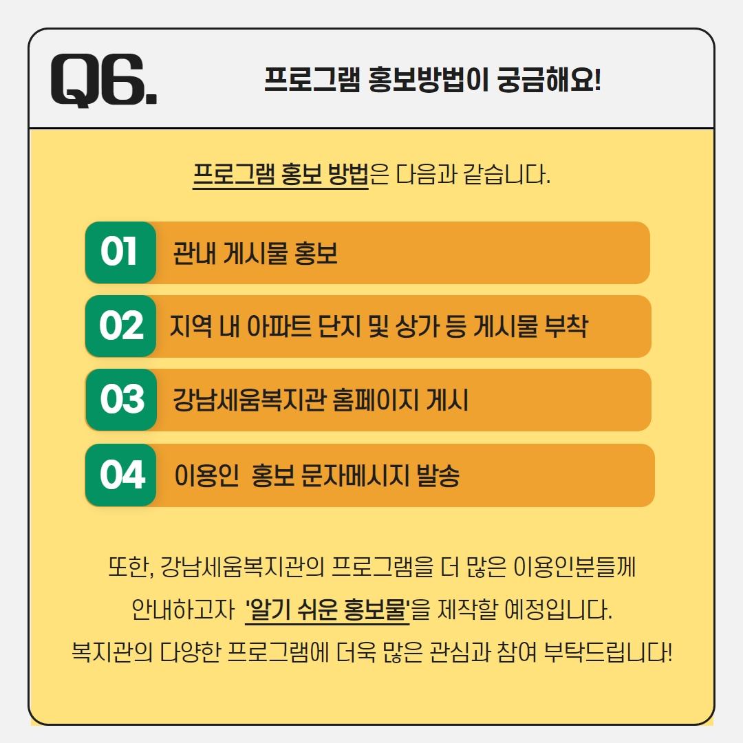 또한, 강남세움복지관의 프로그램을 더 많은 이용인분들게 안내하고자 '알기 쉬운 홍보물'을 제작할 예정입니다. 복지관의 다양한 프로그램에 더욱 많은 관심과 참여 부탁드립니다!