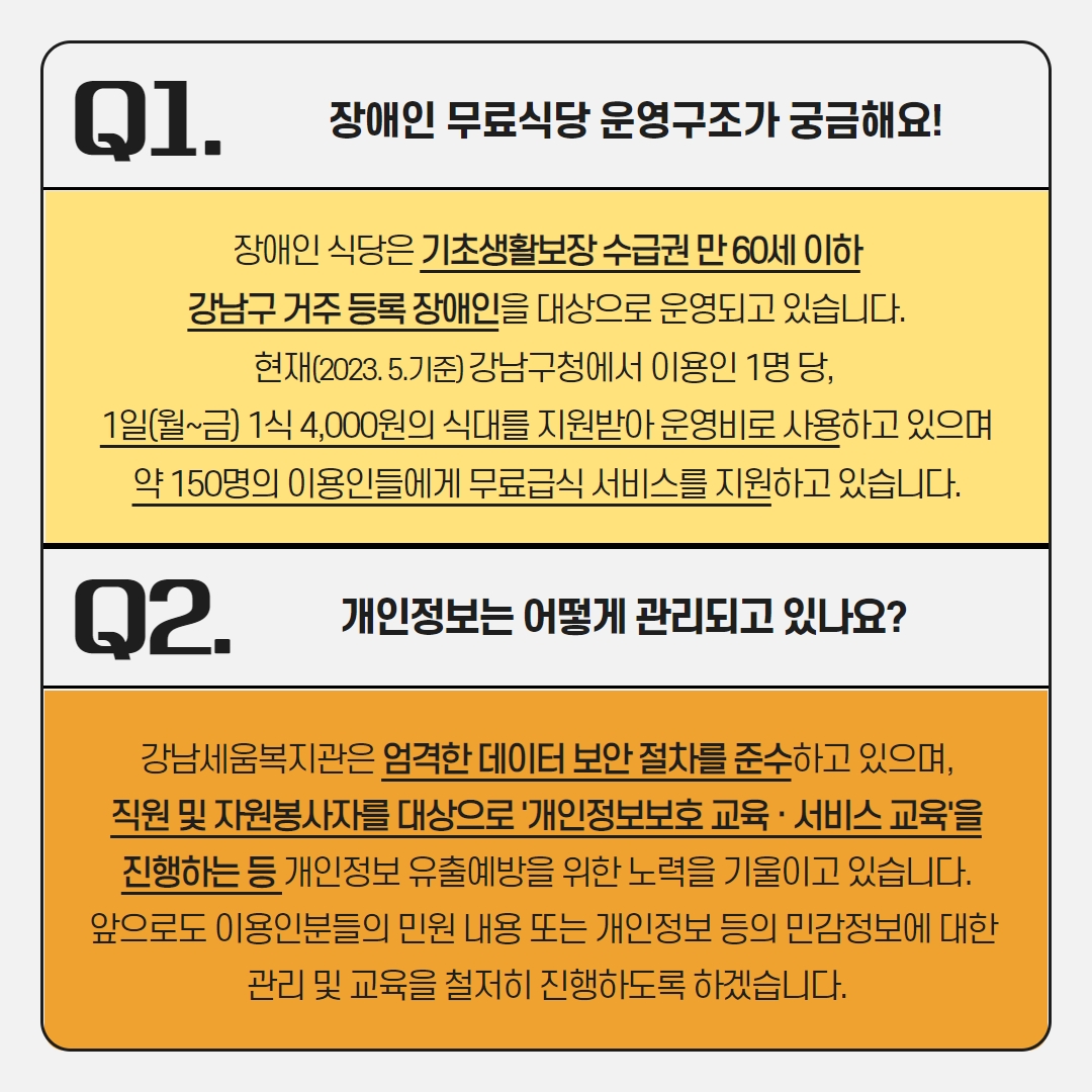 A. 장애인 식당은 기초생활보장 수급권 만 60세 이하 강남구 거주 등록 장애인을 대상으로 운영되고 있습니다. 현재(2023. 5.기준) 강남구청에서 이용인 1명 당, 1일(월~금) 1식 4,000원의 식대를 지원받아 운영비로 사용하고 있으며 약 150명의 이용인들에게 무료급식 서비스를 지원하고 있습니다.