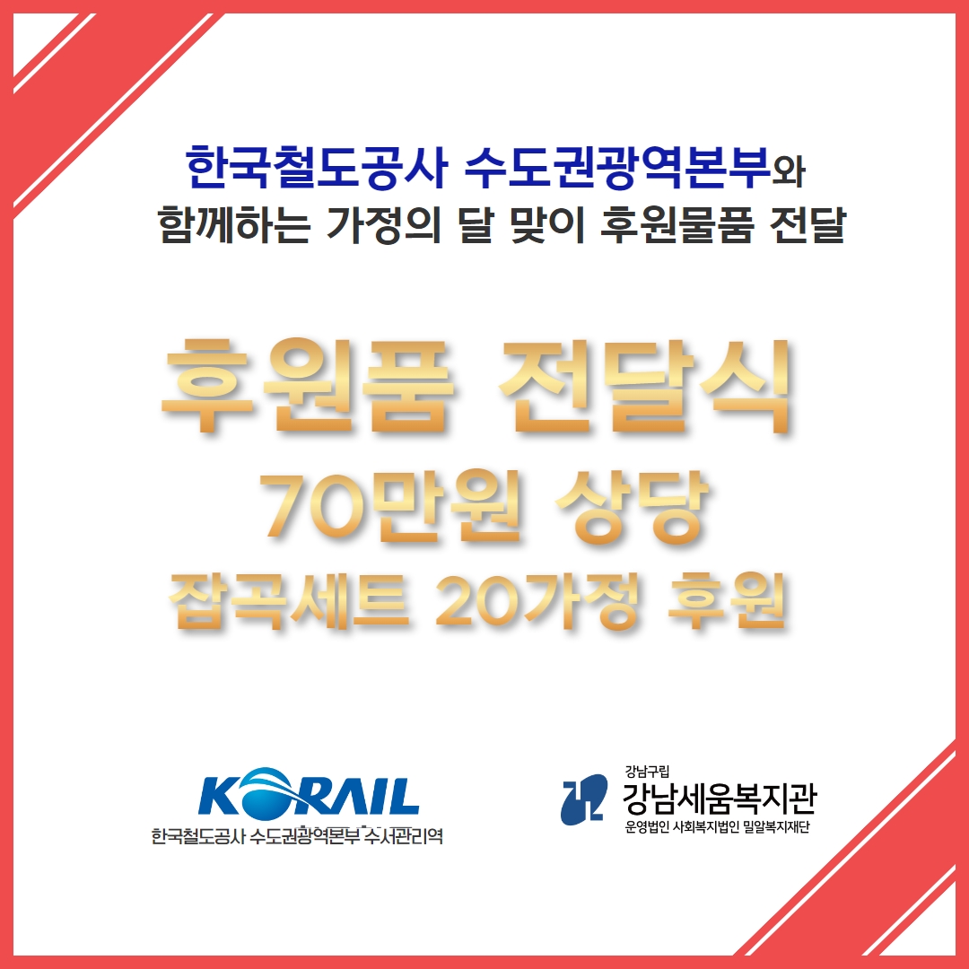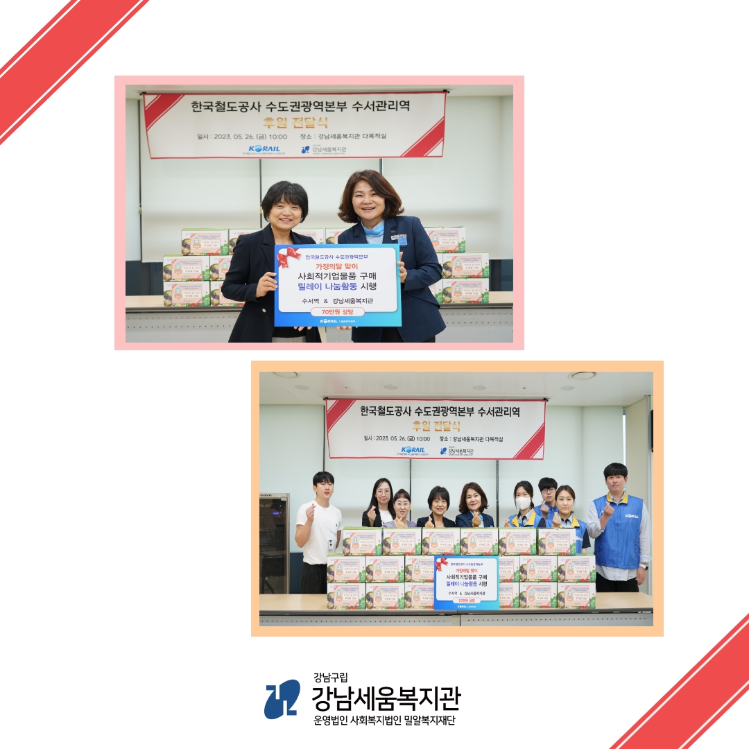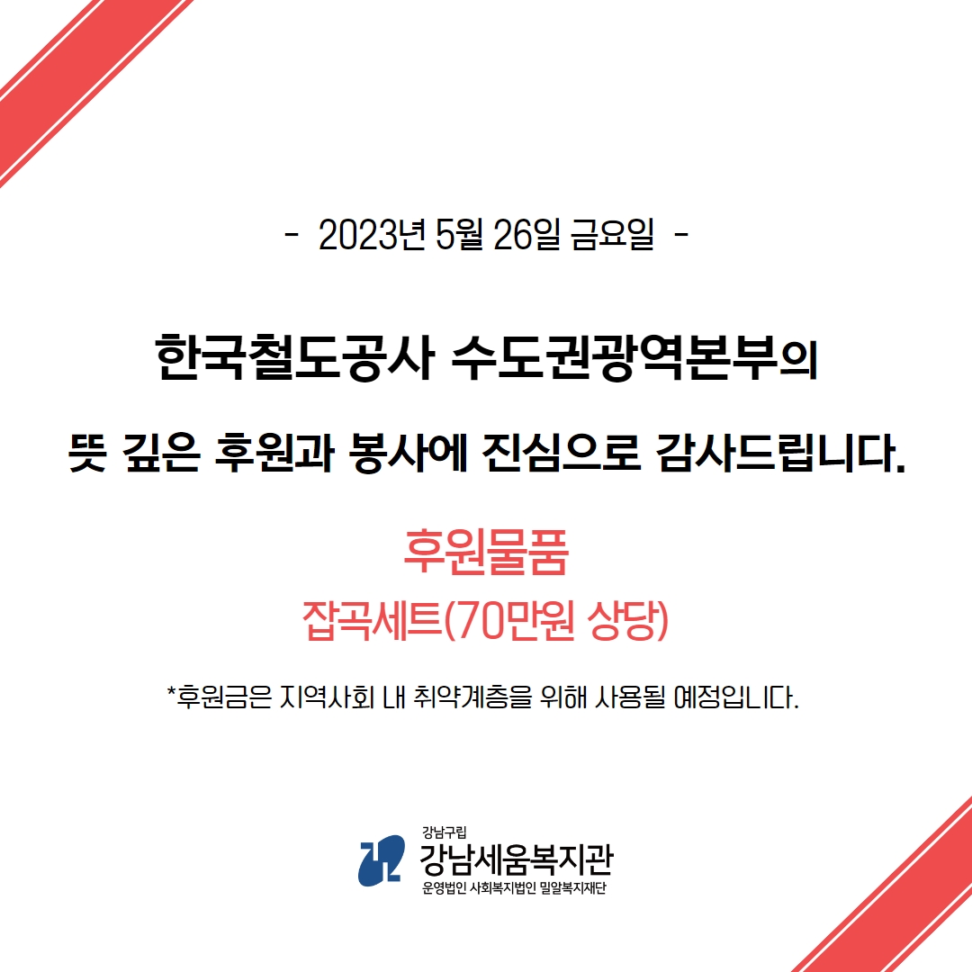 2023년 5월 26일(금) 한국철도공사 수도권광역본부 수서관리역(역장 유희정)에서 강남세움복지관에 잡곡세트(70만원 상당)를 후원해주셨습니다.