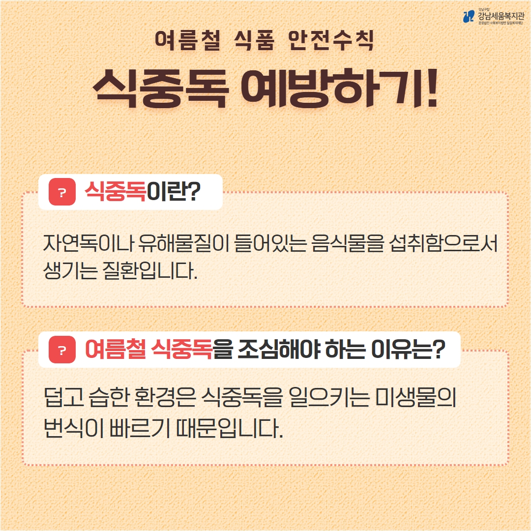 - 여름철 식중독을 조심해야 하는 이유는? 덥고 습한 환경은 식중독을 일으키는 미생물의 번식이 빠르기 때문입니다.