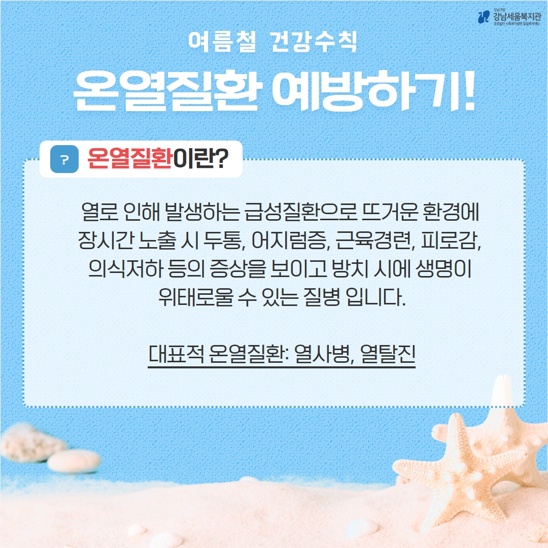 - 온열질환이란? 열로 인해 발생하는 급성질환으로 뜨거운 환경에 장시간 노출 시 두통, 어지럼증, 근육경련, 피로감, 의식저하 등의 증상을 보이고 방치 시에 생명이 위태로울 수 있는 질병입니다. (대표적 온열질환: 열사병, 열탈진)