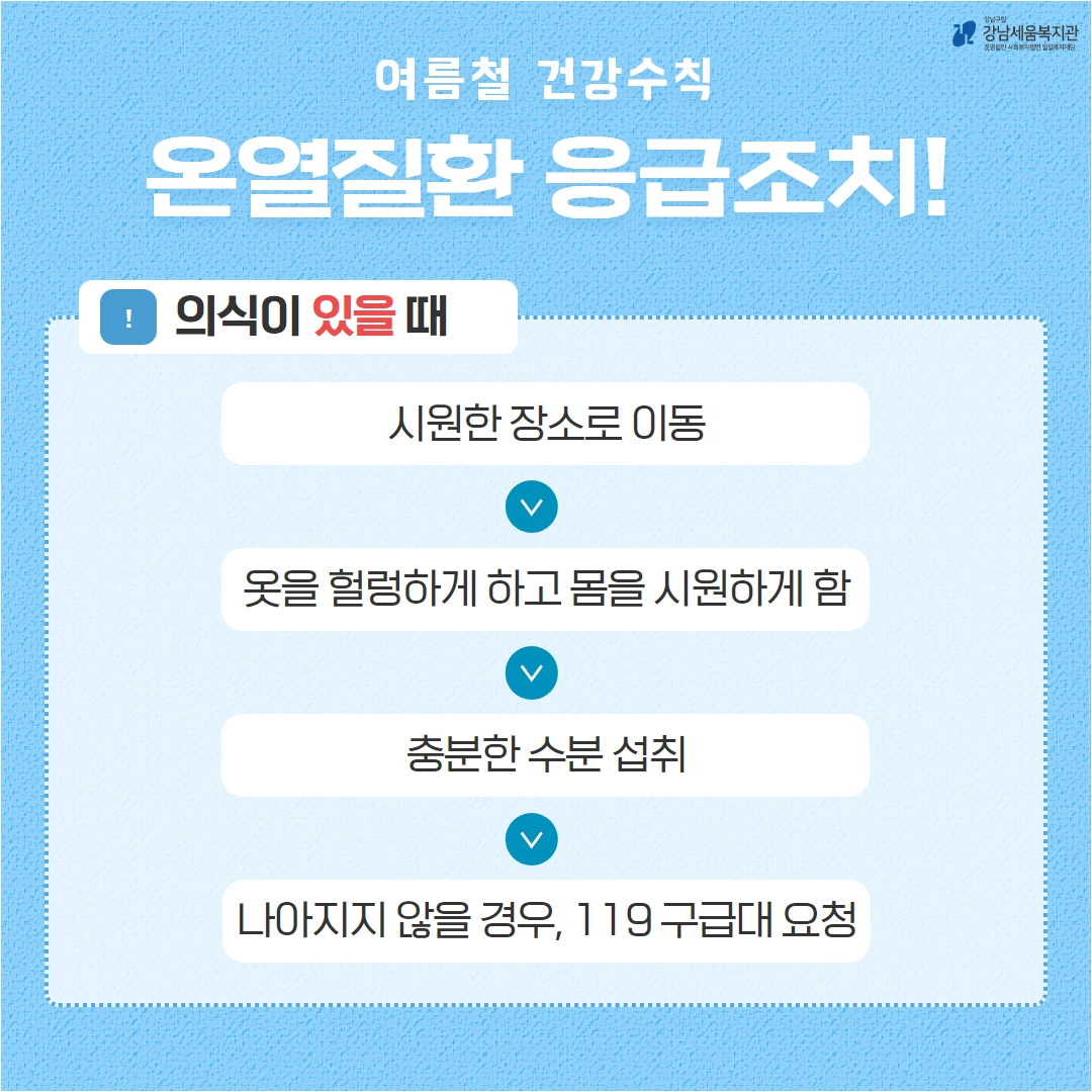 - 의식이 있을 때: 시원한 장소로 이동 > 옷을 헐렁하게 하고 몸을 시원하게 함 > 충분한 수분 섭취 > 나아지지 않을 경우, 119 구급대 요청