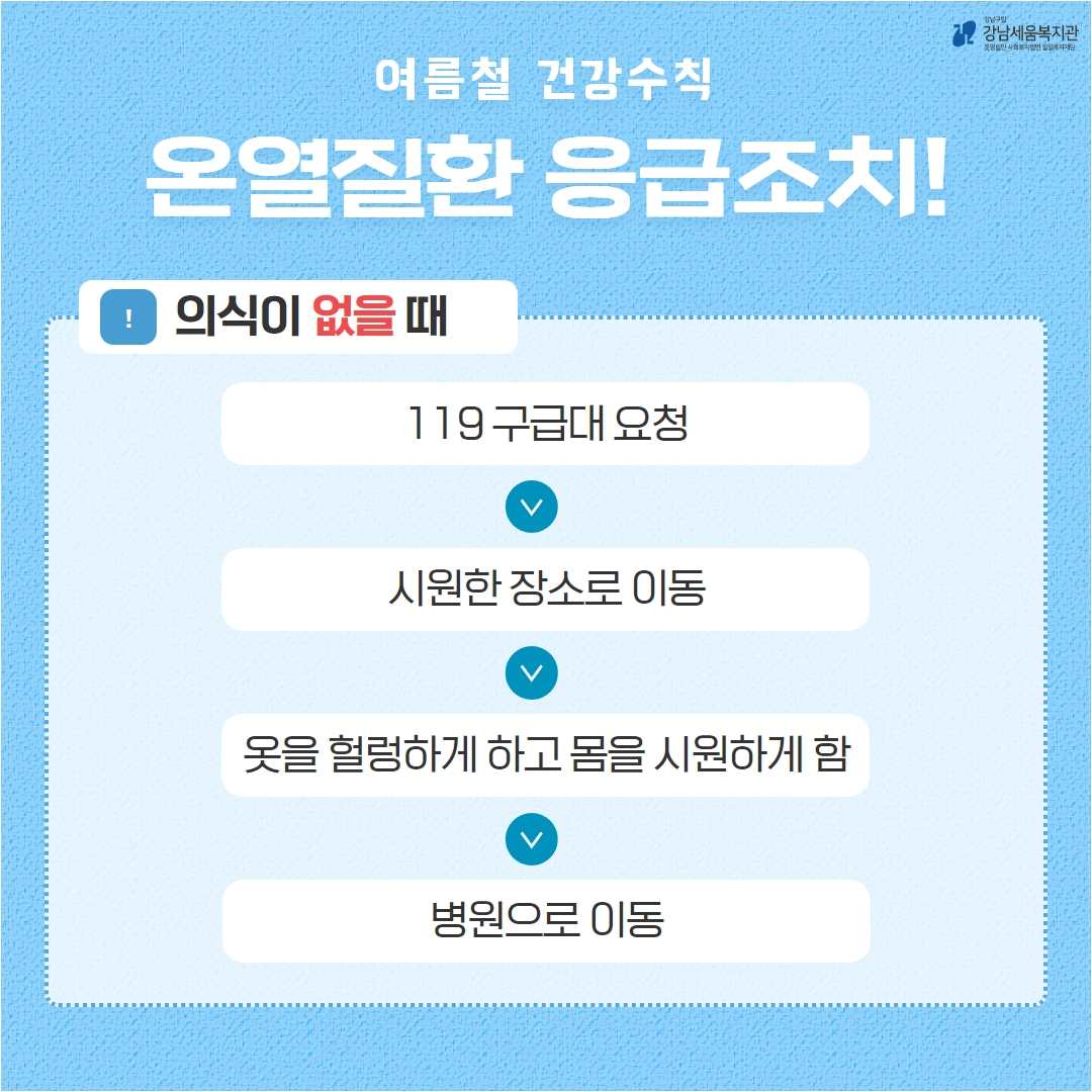 - 의식이 없을 때: 119 구급대 요청 > 시원한 장소로 이동 > 옷을 헐렁하게 하고 몸을 시원하게 함 > 병원으로 이동