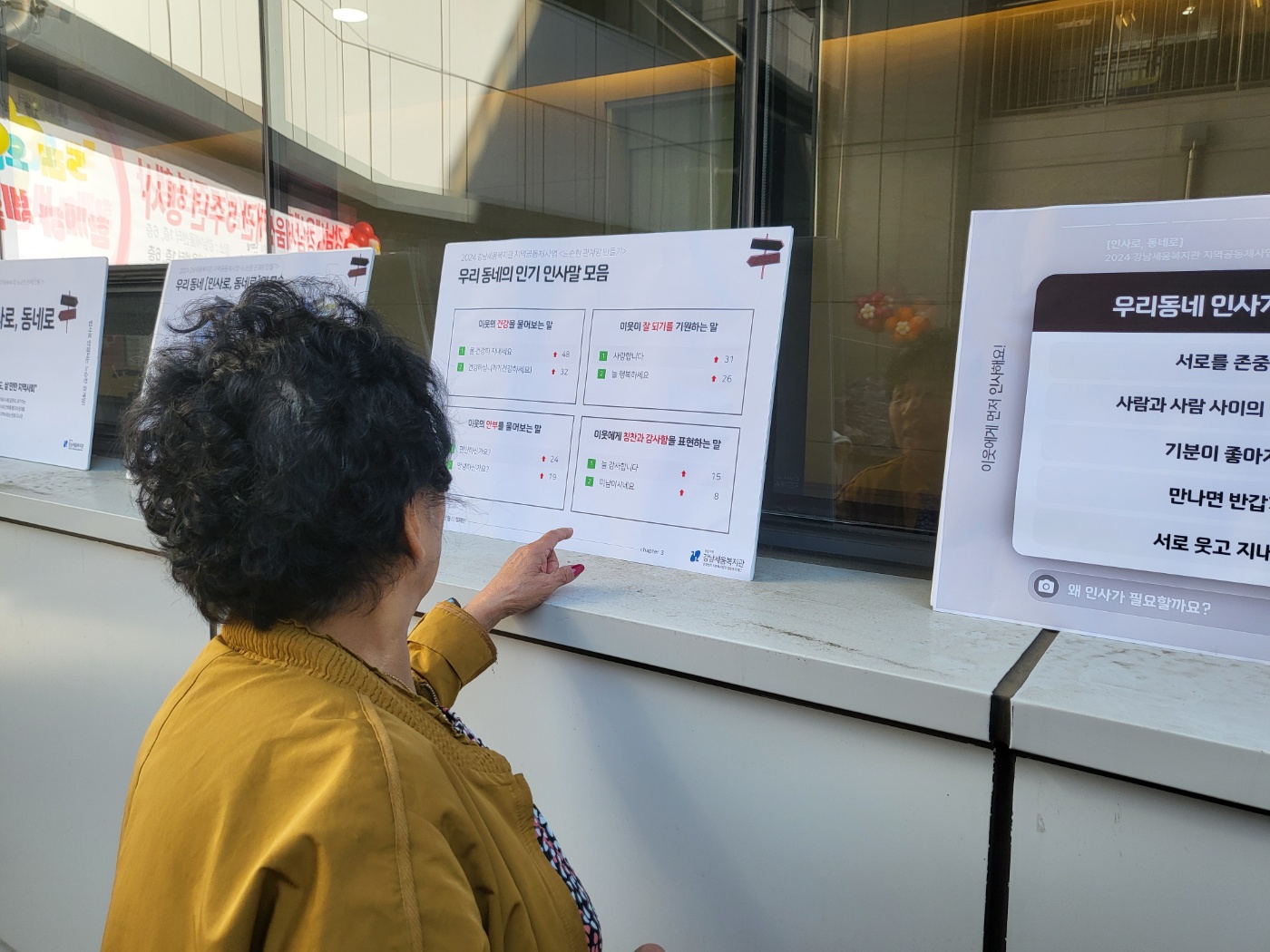 인사를 주제로 진행되는 캠페인을 통해, 우리 지역 주민들이 가장 듣고 싶은, 하고 싶은 인사말을 정해 보았습니다. 연령대가 높은 우리 지역의 특성에 맞게, 많은 지역주민들께서 ‘건강’에 관한 안부를 묻는 인사가 가장 중요하다고 말씀해주셨습니다. “늘 건강하세요!” 라는 인사말과 함께 서로 한층 더 가까워지는 캠페인이 진행되었습니다.