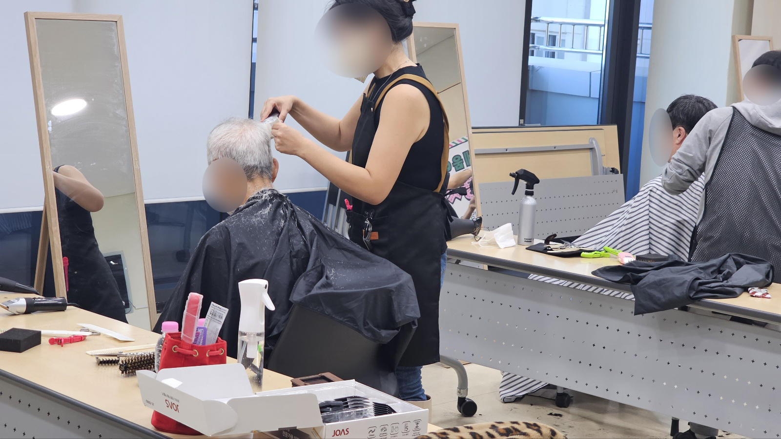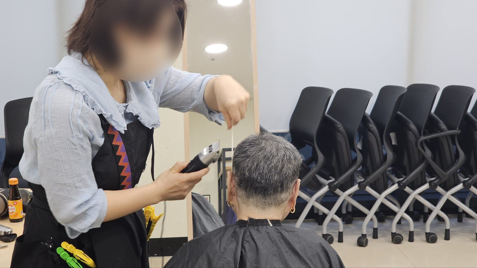▲ 사진 : 이미용서비스 진행사진(커트하는 모습 4장)