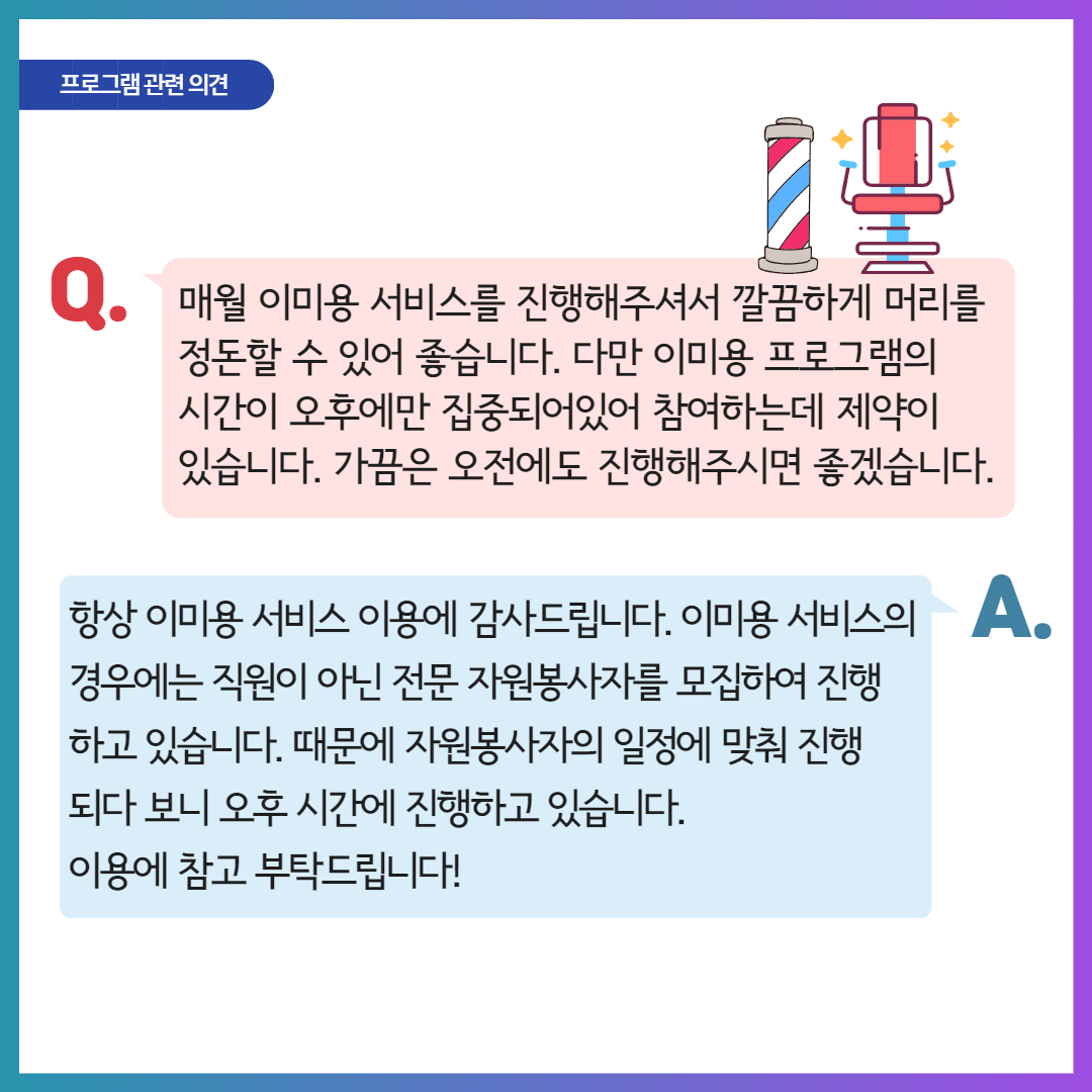 (질문) 매월 이미용 서비스를 진행해주셔서 깔끔하게 머리를 정돈할 수 있어 좋습니다. 다만 이미용 프로그램의 시간이 오후에만 집중되어있어 참여하는데 제약이 있습니다. 가끔은 오전에도 진행해주시면 좋겠습니다.