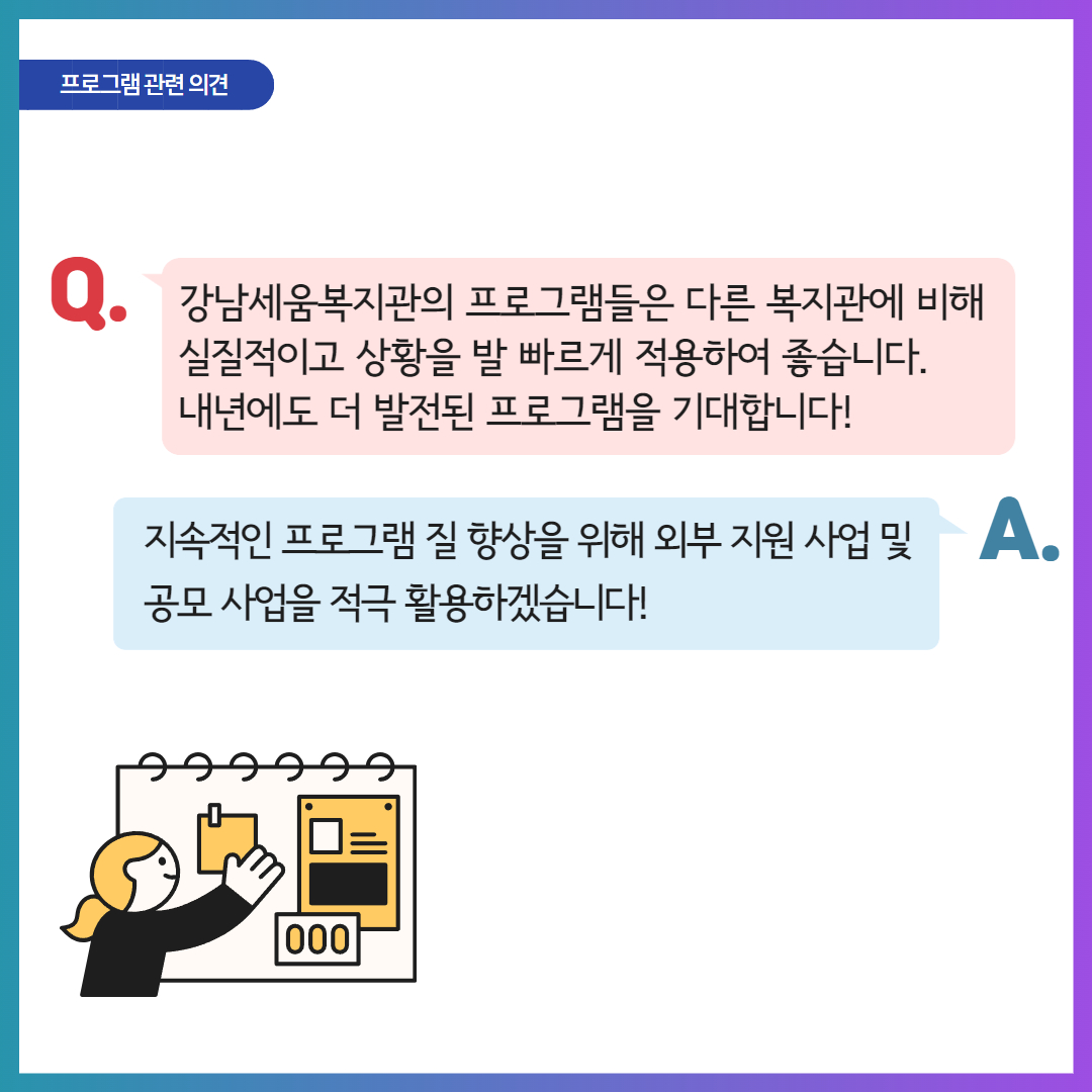 (질문) 강남세움복지관의 프로그램들은 다른 복지관에 비해 실질적으로 상황을 발 빠르게 적용하여 좋습니다. 내년에도 더 발전된 프로그램을 기대합니다!