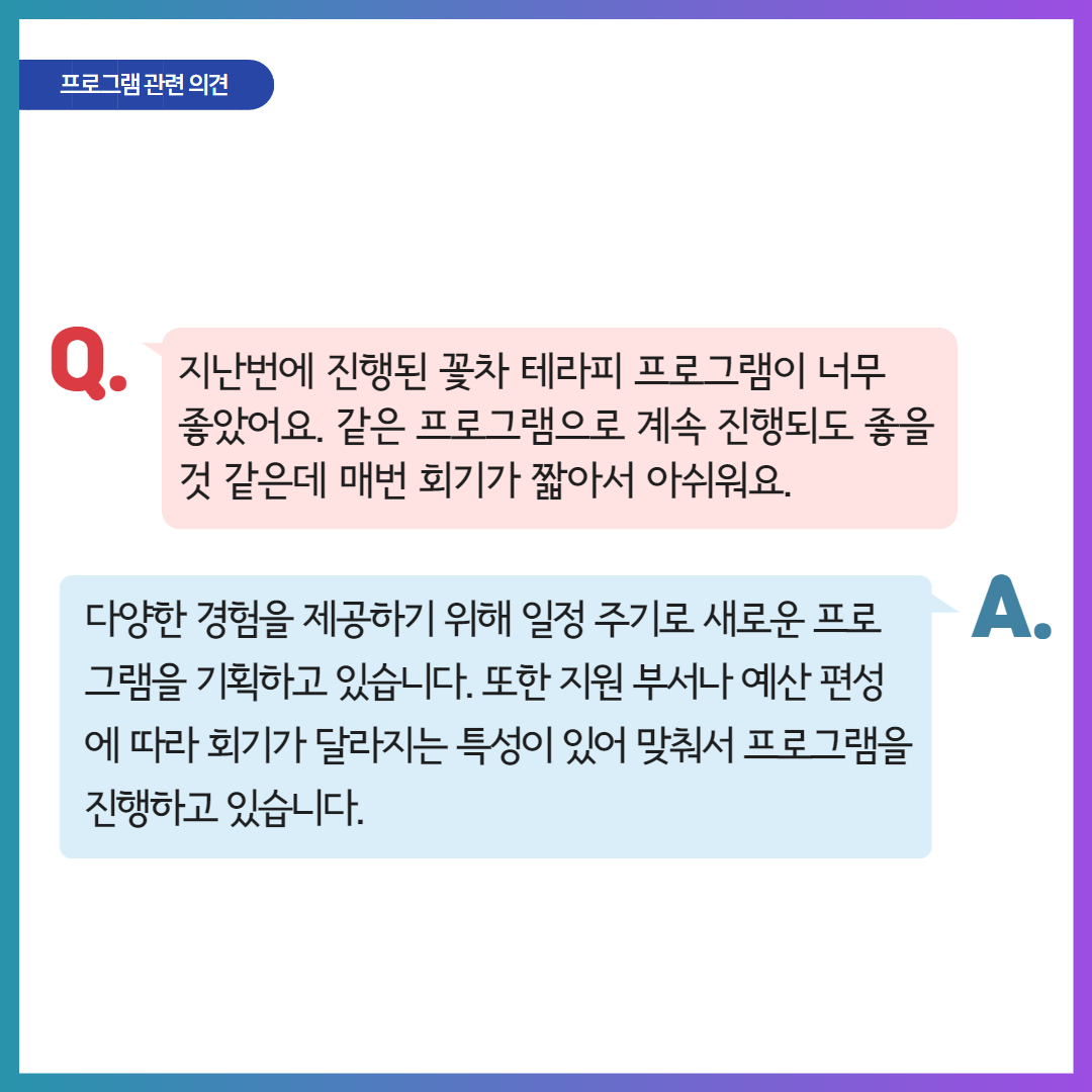(질문) 지난번에 진행된 꽃차 테라피 프로그램이 너무 좋았어요. 같은 프로그램으로 계속 진행되도 좋을 것 같은데 매번 회기가 짧아서 아쉬워요.