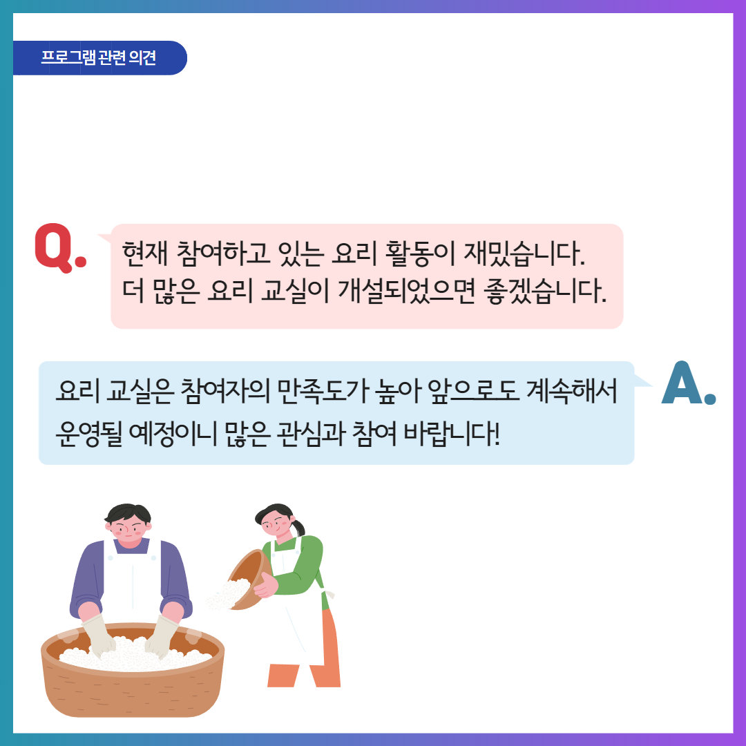 (질문) 현재 참여하고 있는 요리 활동이 재밌습니다. 더 많은 요리 교실이 개설되었으면 좋겠습니다.