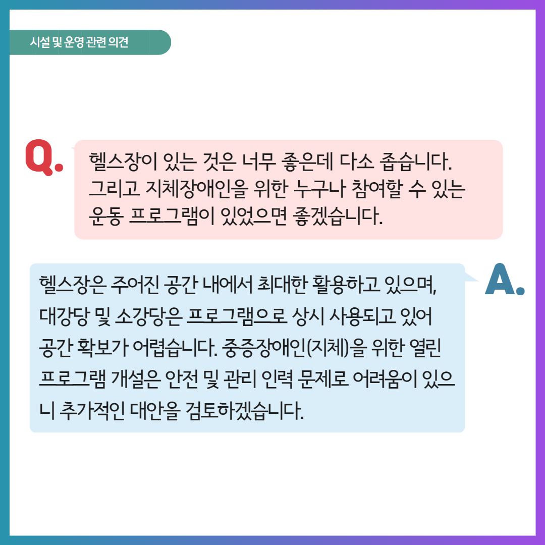 (질문) 헬스장이 있는 것은 너무 좋은데 다소 좁습니다. 그리고 지체장애인을 위한 누구나 참여할 수 있는 운동 프로그램이 있었으면 좋겠습니다.