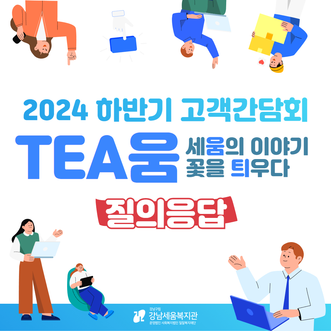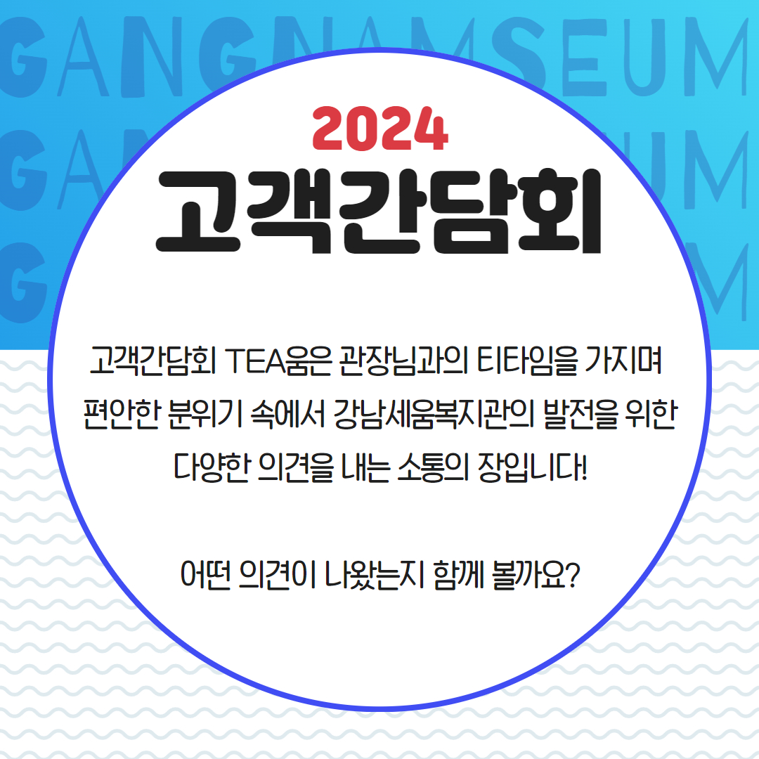 고객간담회 TEA(틔)움은 관장님과의 티타임을 가지며 편안한 분위기 속에서 강남세움복지관의 발전을 위한 다양한 의견을 내는 소통의 장입니다! 하반기에는 어떤 의견이 나왔는지 함께 볼까요?