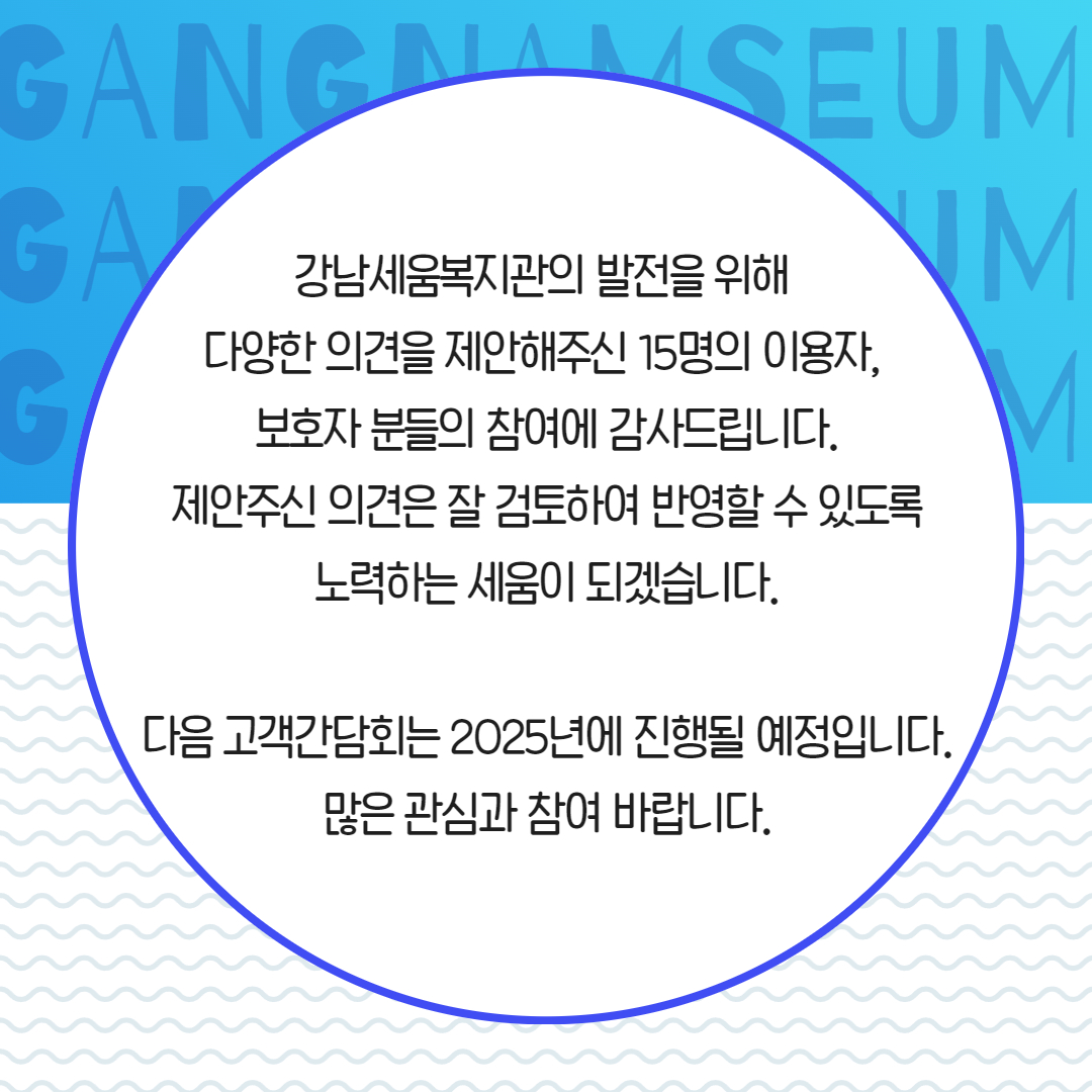 강남세움복지관의 발전을 위해 다양한 의견을 제안해주신 15명의 이용자, 보호자 분들의 참여에 감사드립니다. 제안주신 의견은 잘 검토하여 반영할 수 있도록 노력하는 세움이 되겠습니다. 다음 고객간담회는 2025년에 진행될 예정입니다. 많은 관심과 참여 바랍니다.