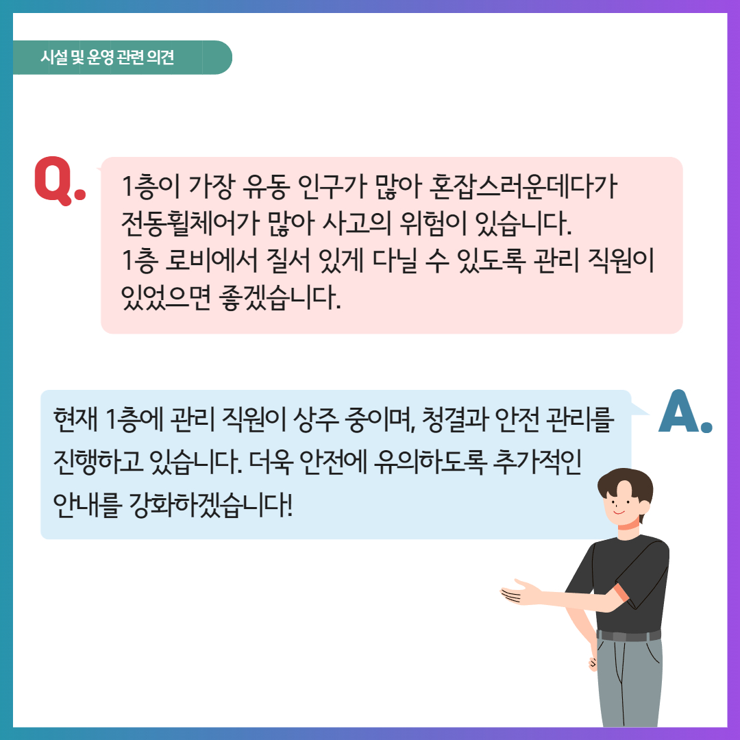 (질문) 1층이 가장 유동 인구가 많아 혼잡스러운데다가 전동 휠체어가 많아 사고의 위험이 있습니다. 1층 로비에서 질서 있게 다닐 수 있도록 관리 직원이 있었으면 좋겠습니다.