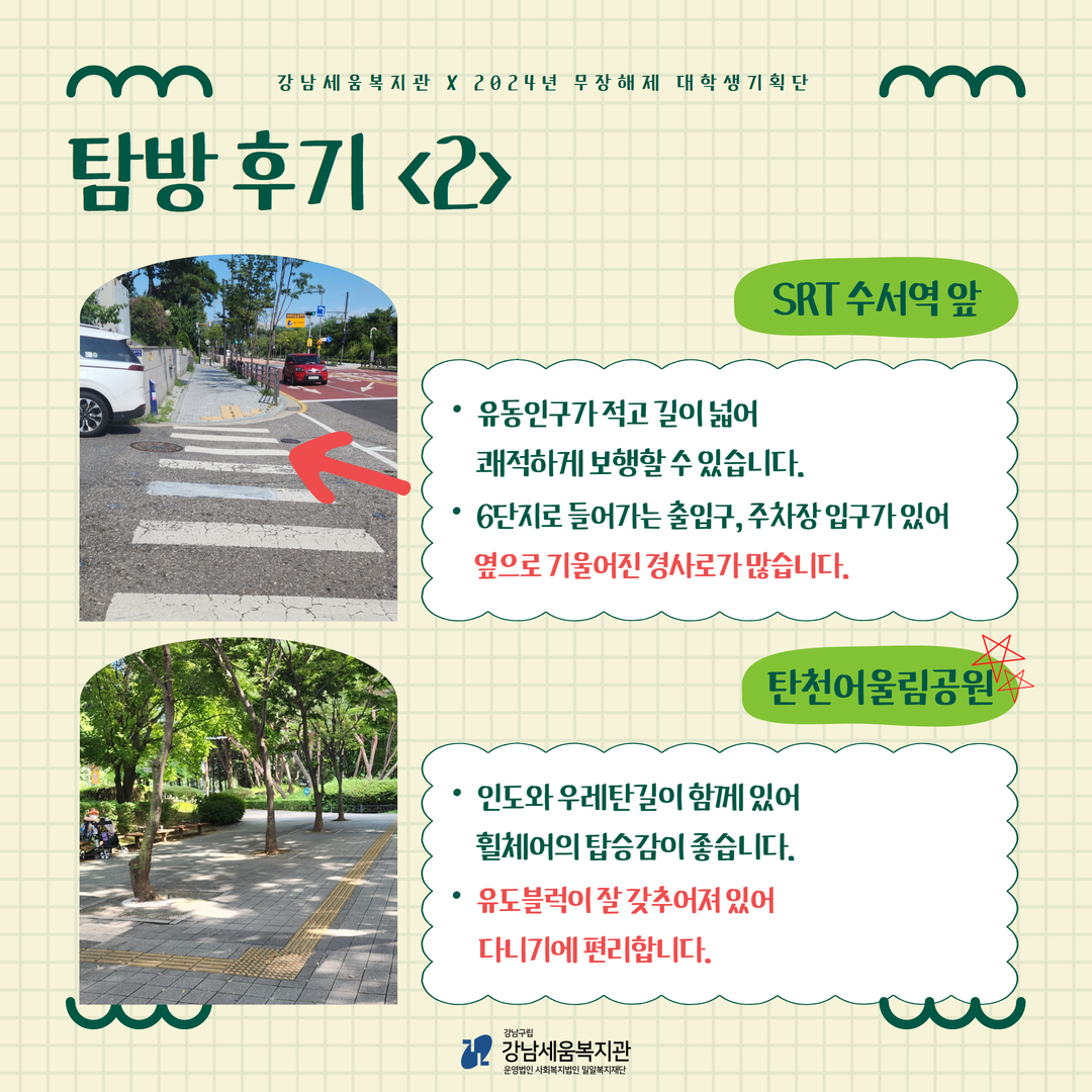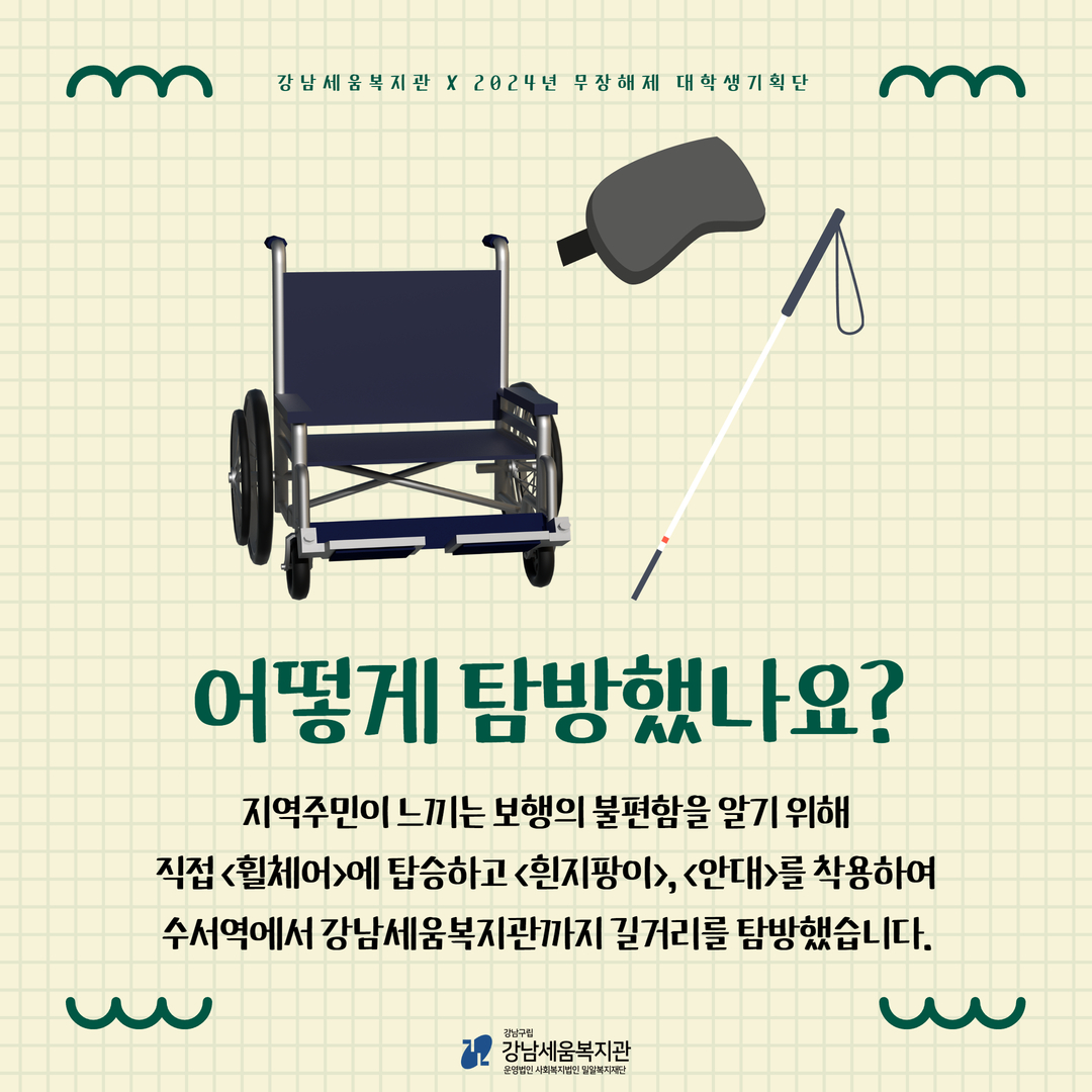 지역주민이 느끼는 보행의 불편함을 알기 위해 직접 휠체어에 탑승하고 흰지팡이, 안대를 착용하여 수서역에서 강남세움복지관까지 길거리를 탐방했습니다.
