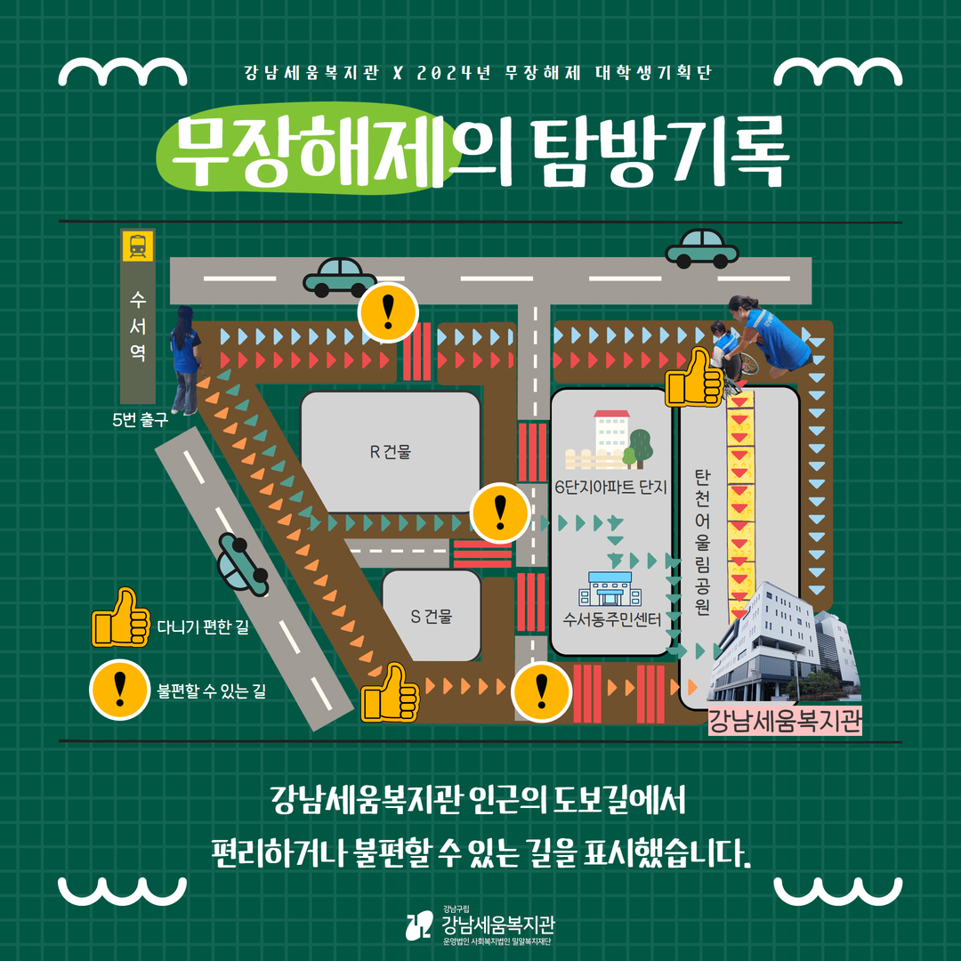 강남세움복지관 인근의 도보길에서 편리하거나 불편할 수 있는 길을 표시했습니다.
