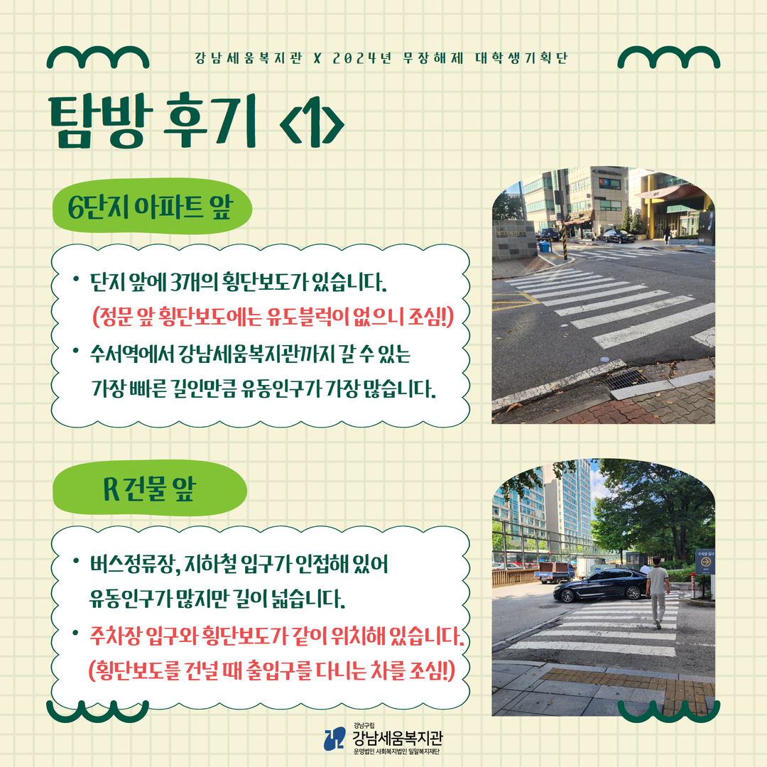 6단지 아파트 앞은 3개의 횡단보도가 있습니다. 정문 앞 횡단보도에 유도블럭이 없으니 조심하세요. 수서역에서 강남세움복지관까지 갈 수 있는 가장 빠른 길인만큼 유동인구가 가장 많습니다.