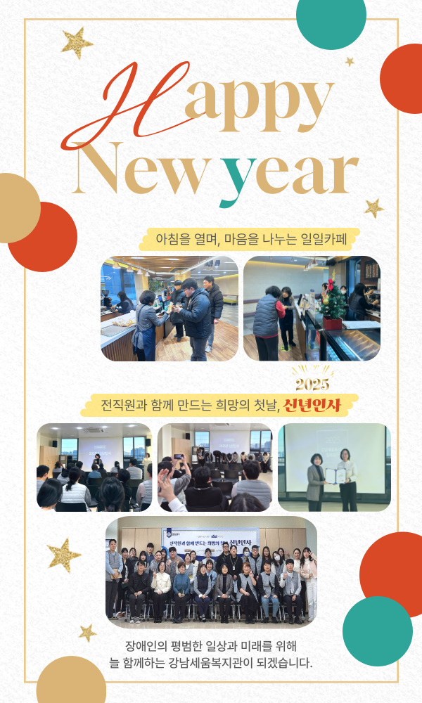 2025년 1월 2일 시무식을 개최하며 희망찬 새해의 시작을 알렸습니다. 이날 김귀자 관장님을 비롯 각 시설장들은 출근길에 직원들에게 직접 커피와 빵을 나눠주며 따뜻한 신년 인사를 전했습니다.