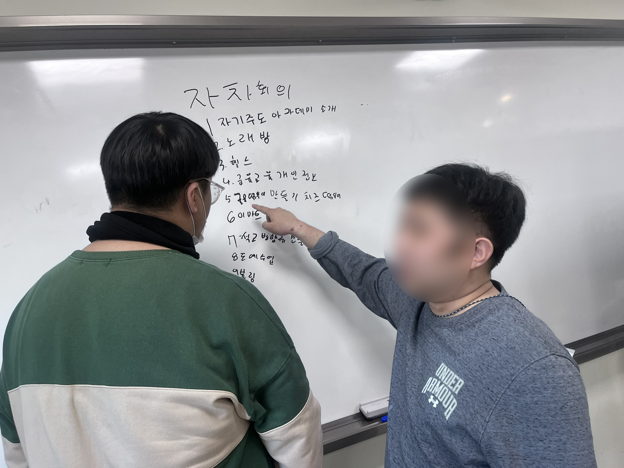 한 참여자는 1월에 좋았던 활동을 묻자, 칠판 앞으로 나와 "떡볶이!", "노래방!"이라고 큰 목소리로 이야기하며 즐거움을 나누었습니다. 또, 서기 역할을 맡은 참여자는 회의 내용을 집중해서 듣고 꼼꼼하게 회의록을 기록했습니다.