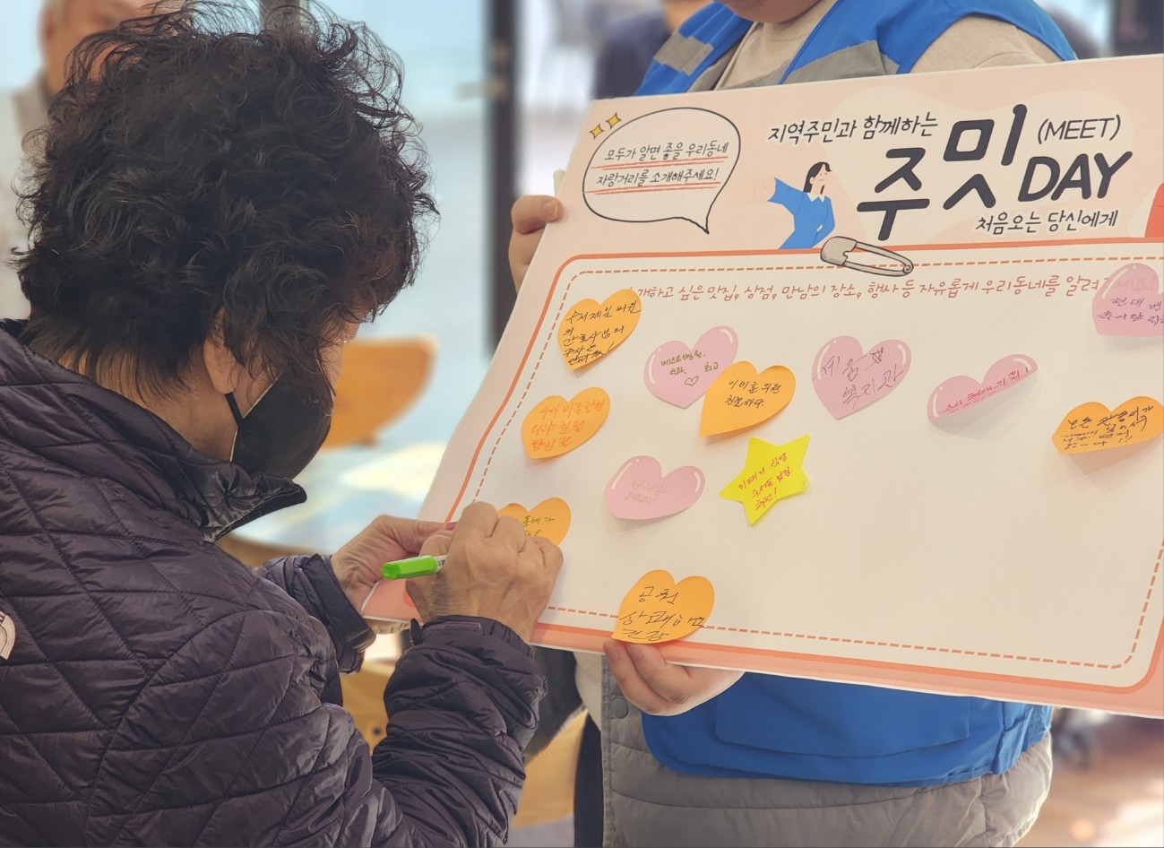 따사로운 햇살이 달콤한 3월의 어느날, <처음오는 당신에게> 라는 주제로 주밋(MEET)데이가 진행되었습니다. 우리 동네에 처음 오는 누군가에게 이것 하나만큼은 꼭! 알려주고 싶은 우리 지역의 자랑거리를 소개해주셨습니다. 주민이 추천하는 맛집, 찐 주민들이 이용하는 만남의 공간, 동네를 대표하는 축제까지,,, 우리 지역의 다양하고 유용한 정보를 확인 할 수 있었습니다.