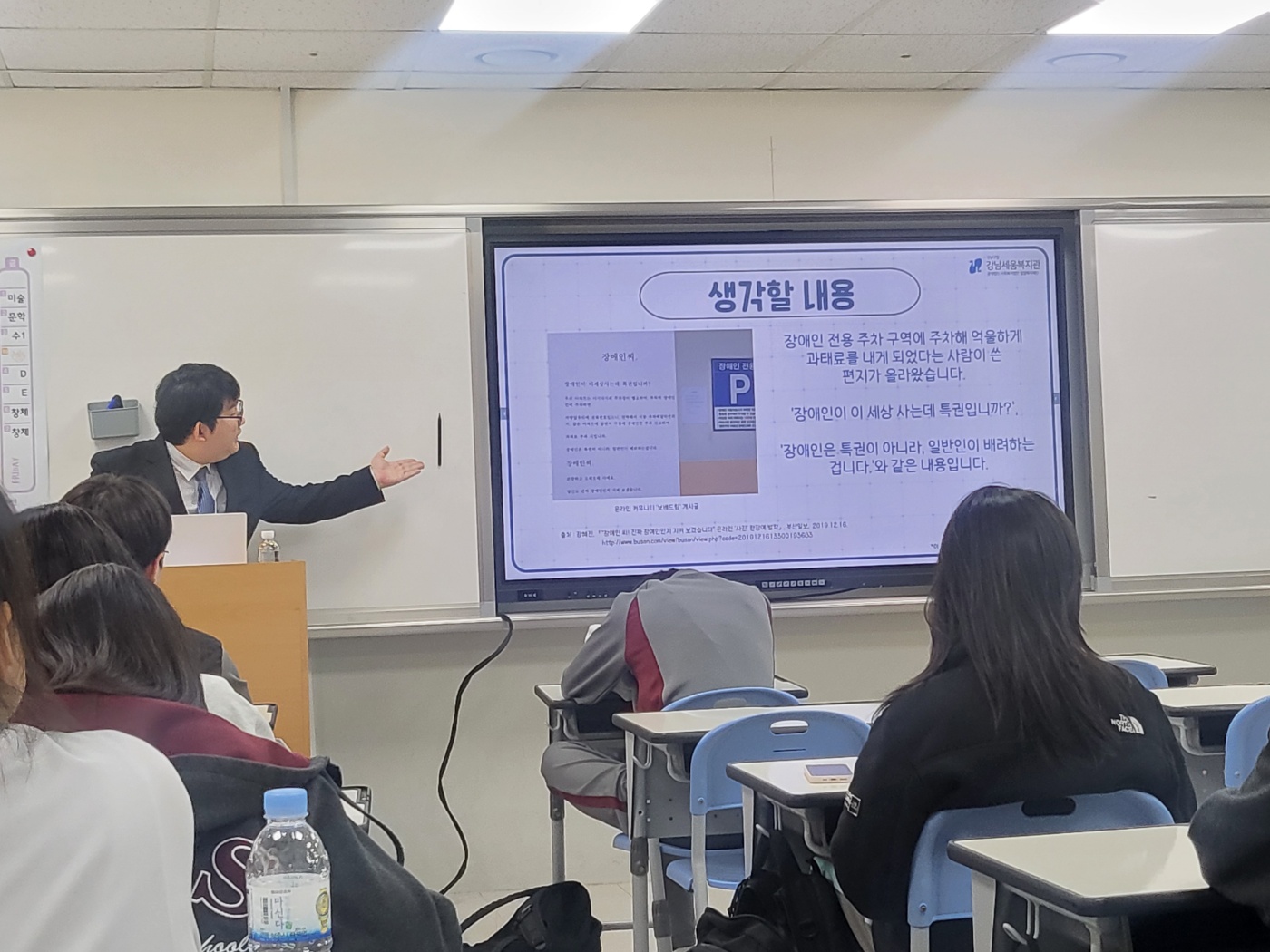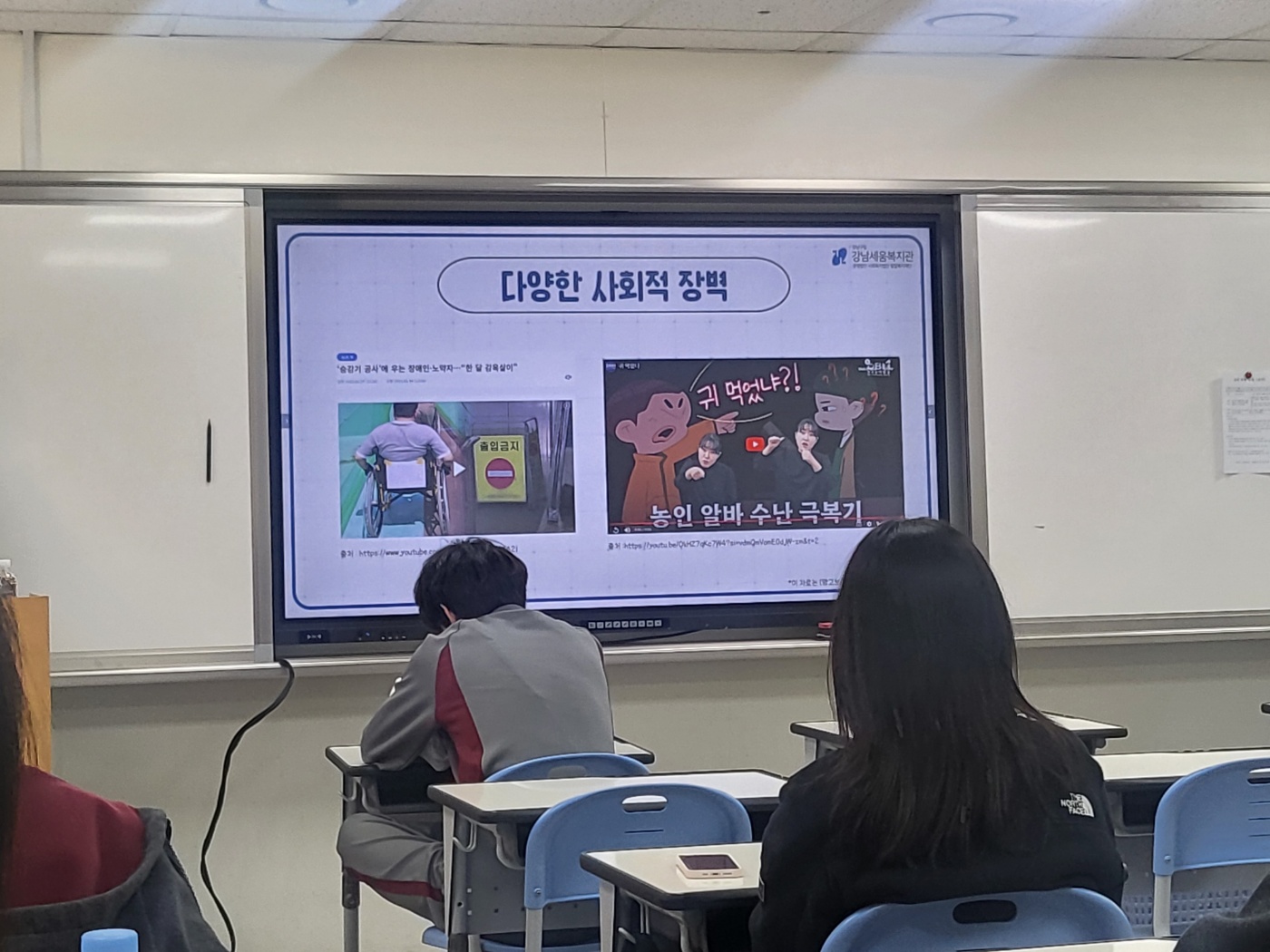 풍문고등학교 <풍문 프로젝트> 참여 학생과 함께하는 『소통을 중심으로 배우는 장애인식개선』 교육이 진행되었습니다. 1회기는 사회적 장벽, 장애인과 비장애인의 사회적 인식, 에티켓, 그리고 정보 전달을 위한 쉬운 글쓰기 방법을 살펴보며, 장애에 대한 이해와 실질적인 방법을 알아보는 시간을 가졌습니다. 앞으로도 회기별 교육을 통해 장애에 대해 더 잘 이해하고 자연스럽게 소통할 수 있도록 알차고 도움이 되는 시간을 만들어갈 예정입니다. 강남세움복지관 장애인식개선교육에 많은 관심 바랍니다.