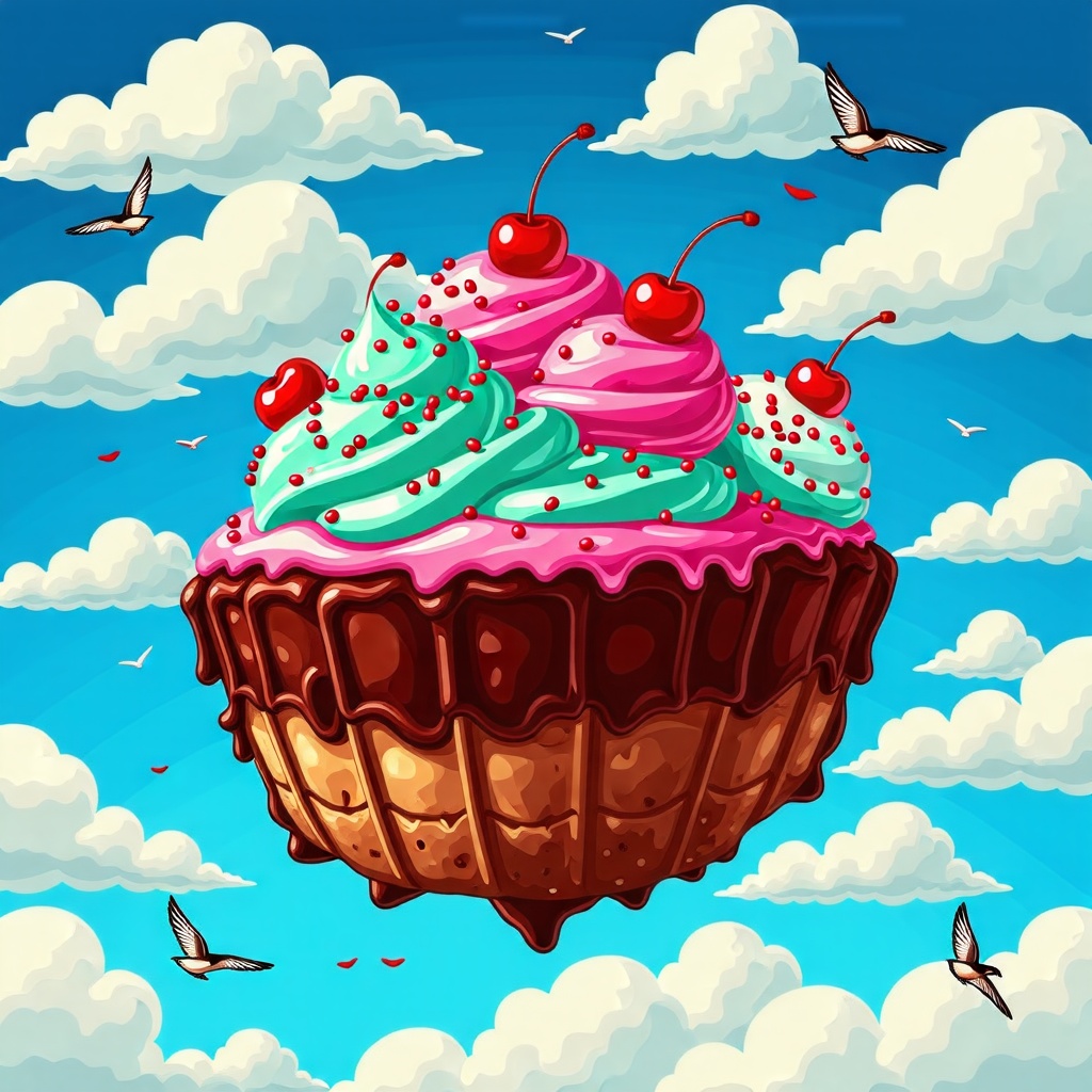 ▶이미지 4. 유OO님이 만든 상상 속 이미지입니다. 하늘을 나는 커다란 컵케이크 섬으로 직접 그리긴 어렵지만 뤼튼을 활용해 마음껏 상상력을 펼쳐보았습니다.