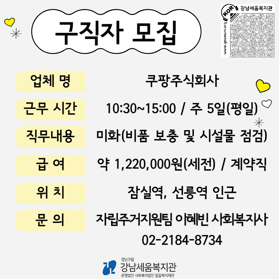 [공고] 장애인 구직자 모집 “쿠팡주식회사” (사무실 미화)
