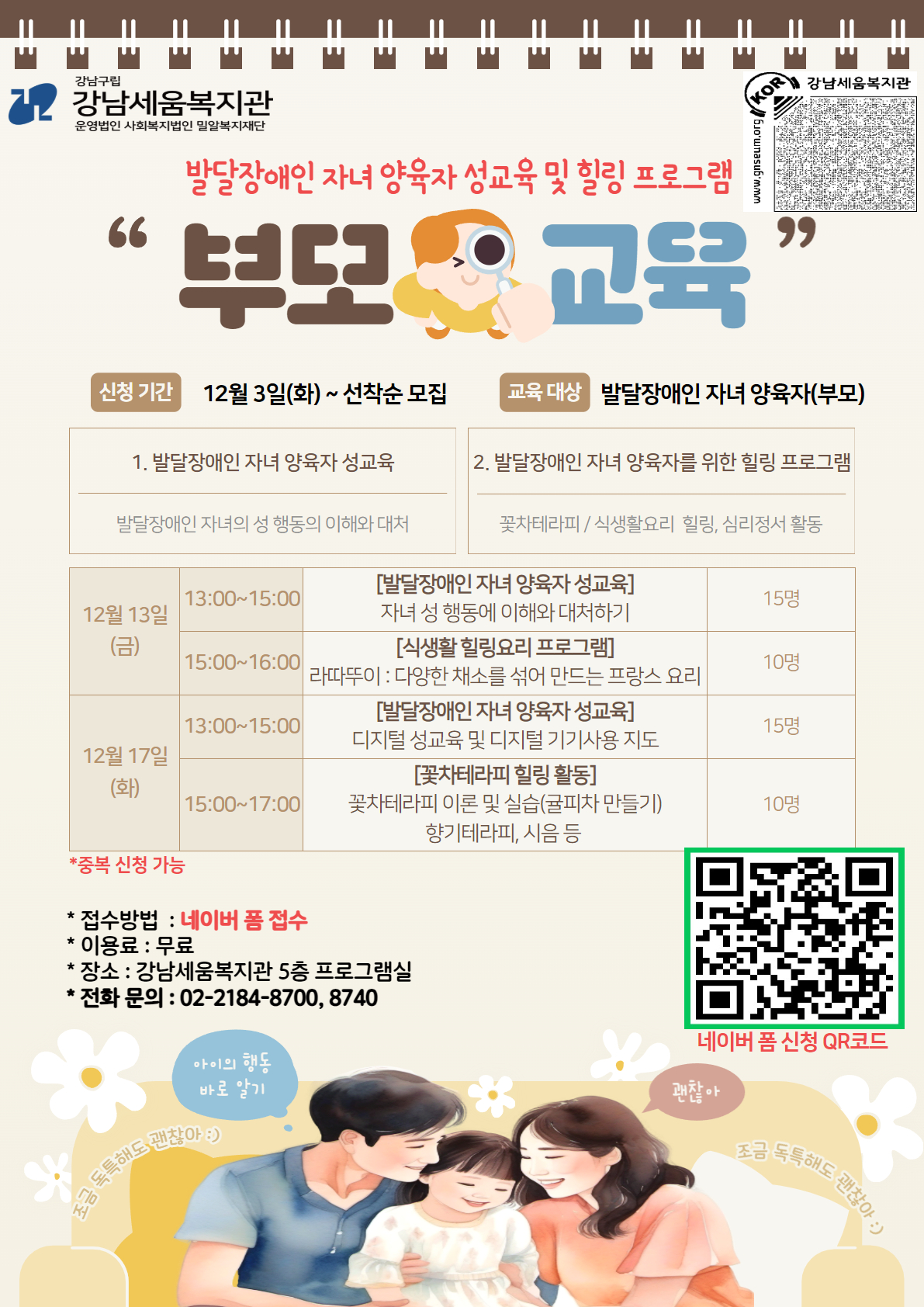 - 사업명 : 2024년 부모교육(발달장애인 양육자 성교육 및 힐링 프로그램) 참여자 모집